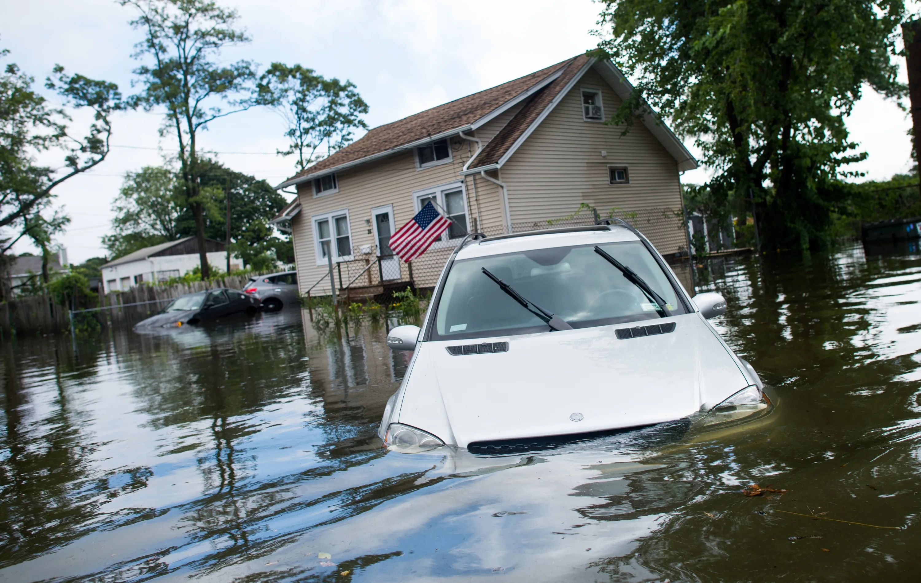 A car is abandoned on a flooded Reddington St. following heavy rains and flash flooding August 13, 2014 in Bayshore, New York. The south shore of Long Island along with the tri-state region saw record setting rain that caused roads to flood entrapping some motorists. (Photo by Andrew Theodorakis/Getty Images)