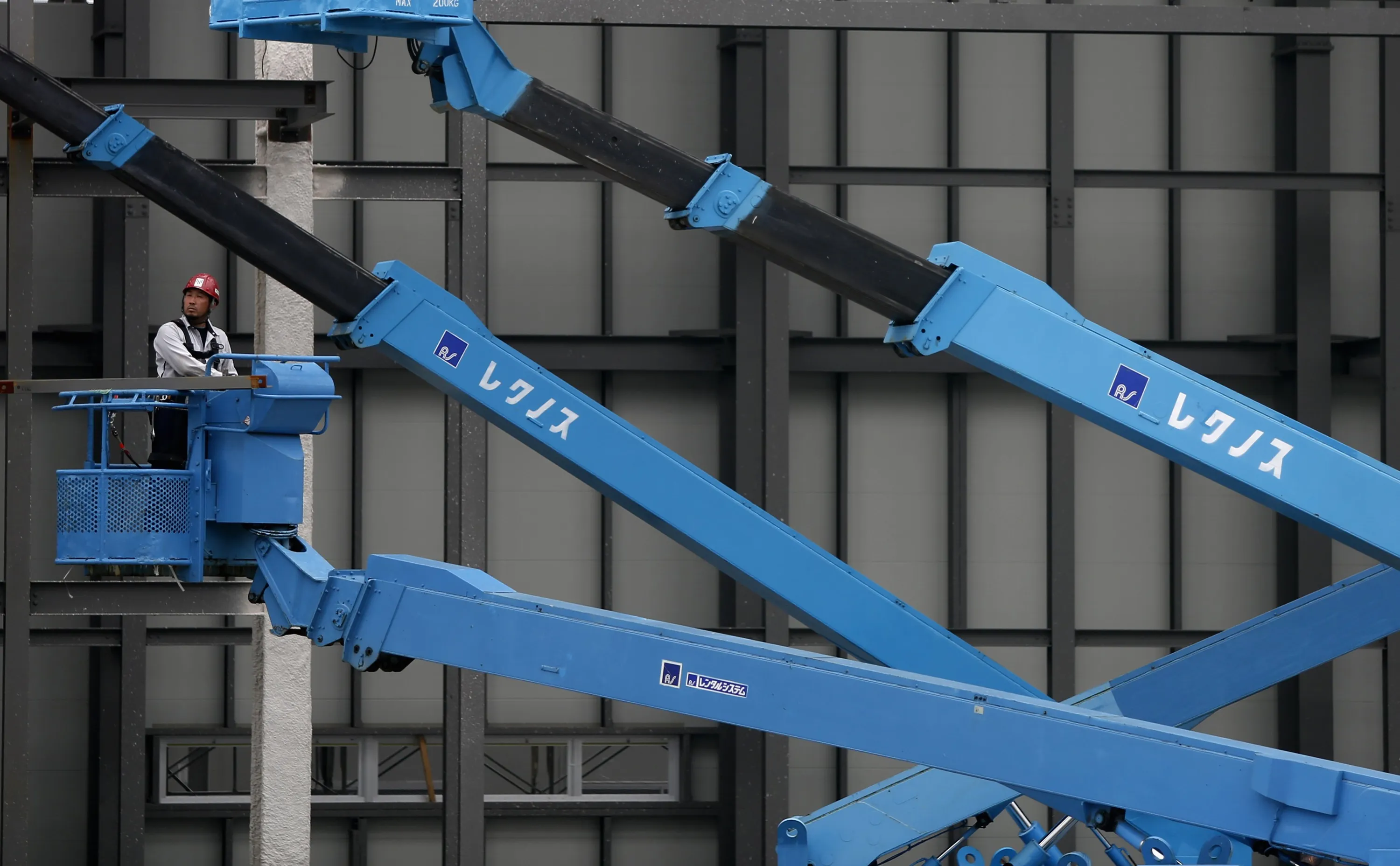 A worker stands on a crane at a construction site in Tokyo August 14, 2014. Japan's core machinery orders rose for the first time in three months in June after a record plunge in May, but weak exports and industrial production cloud the outlook for the capital spending needed to sustain economic growth. (Photo by Yuya Shino/Reuters)