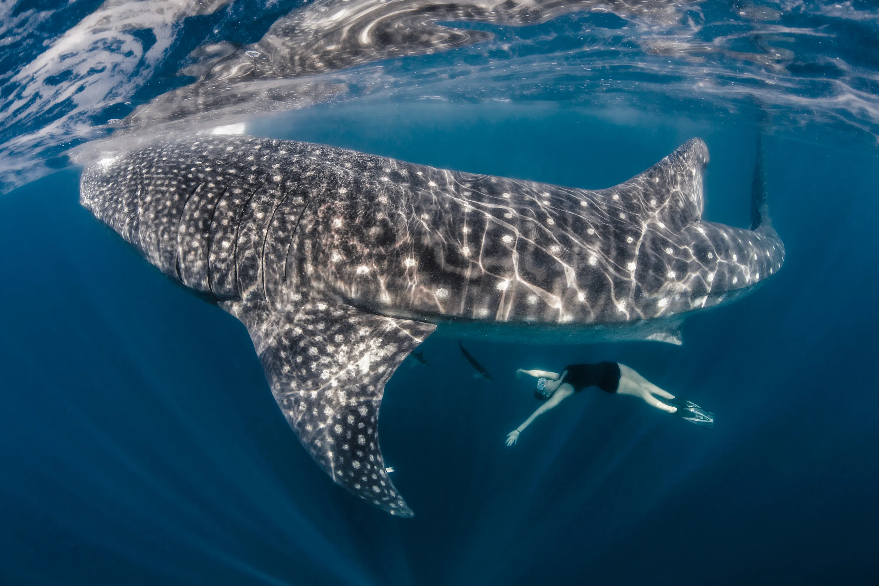 Model, skydiver and wing-suit jumper Roberta Mancino, 33, swims with a whale shark on February 2014 in Isla Mujeres, Mexico. A female skydiver swims with whale sharks, manta rays and sailfish – the fastest fish in the sea. Model, skydiver and wing-suit jumper Roberta Mancino, 33, jumped from a boat into the ocean surrounding Isla Mujeres near the northern Peninsula of Mexico. The incredible project involved two trips to the stormy winter seas – one in February 2013 and one a year later in February 2014. (Photo by Shawn Heinrichs/Barcroft Media)