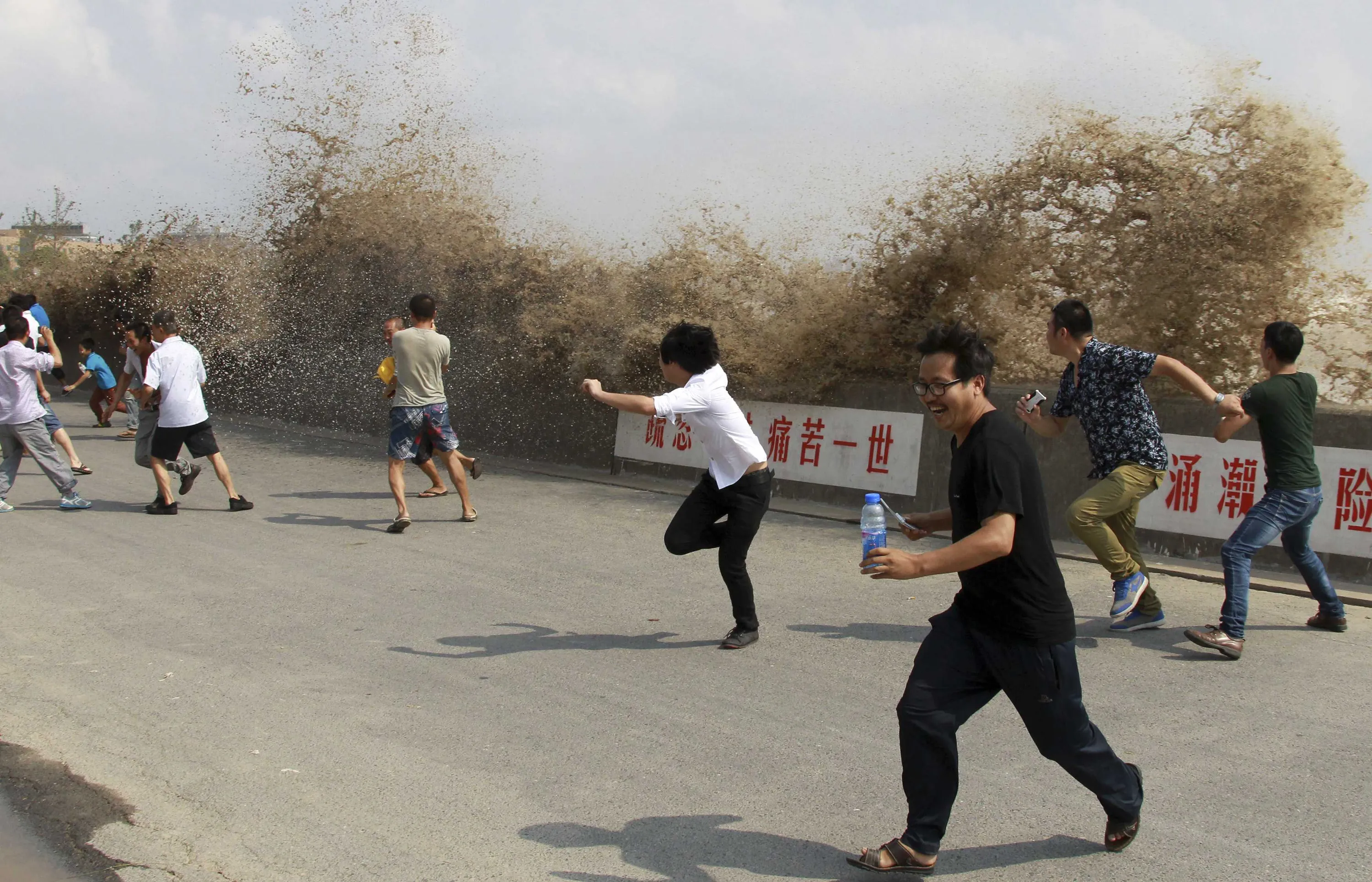 Visitors run away from a tidal bore as it surges past a barrier on the banks of Qiantang River in Hangzhou, Zhejiang province, September 20, 2013. (Photo by Reuters/China Daily)