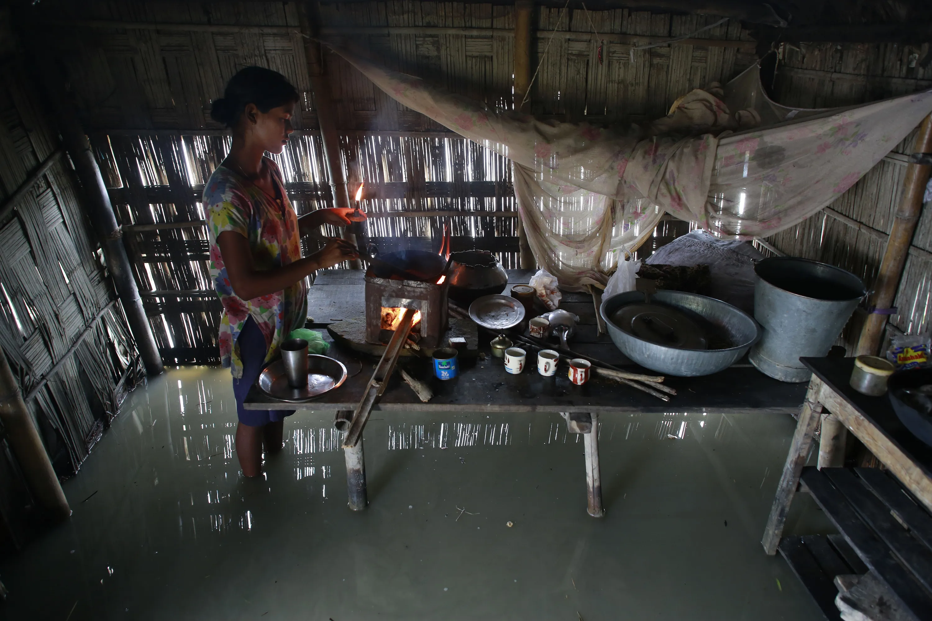 Dupura Akhtar cooks inside her flood-affected house in Ashigarh village, about 70 kilometers (44 miles) east of Gauhati, India, Thursday, August 19, 2014. Heavy rainfall for the past few days has affected several districts of Assam state, flooding dozens of villages and displacing thousands. (Photo by Anupam Nath/AP Photo)