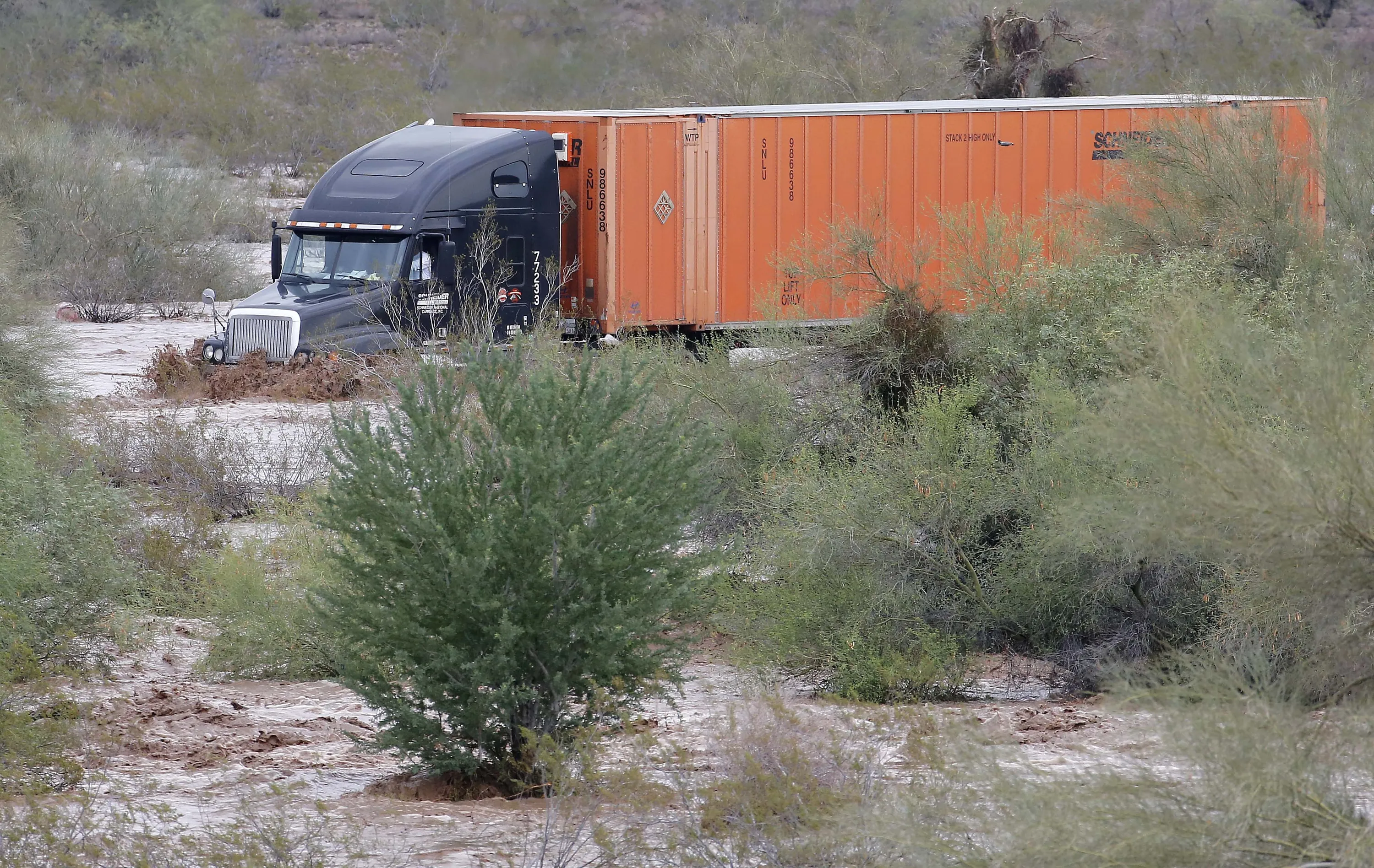 A tractor trailer drives through flash flood waters that overran Skunk Creek, Tuesday, August 19, 2014, in northwestern Phoenix. Flooding from heavy rain in the Phoenix area has forced authorities to close several major roads, including a portion of Interstate 17 about 25 miles north of the city. (Photo by Matt York/AP Photo)