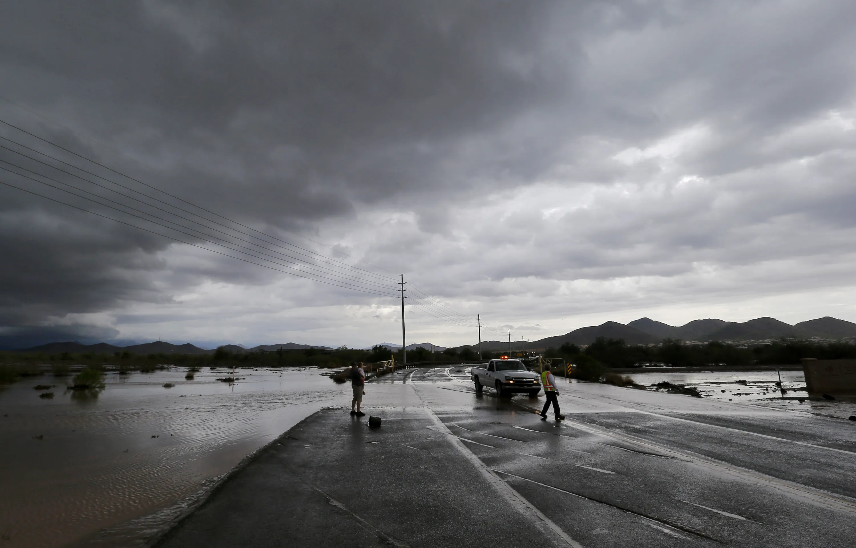 A city of Phoenix official blocks a closed section of road as flash flood waters overrun Skunk Creek through the Sonoran Desert, Tuesday, August 19, 2014, in northwestern Phoenix. Flooding from heavy rain in the Phoenix area has forced authorities to close several major roads, including a portion of Interstate 17 about 25 miles north of the city. (Photo by Matt York/AP Photo)