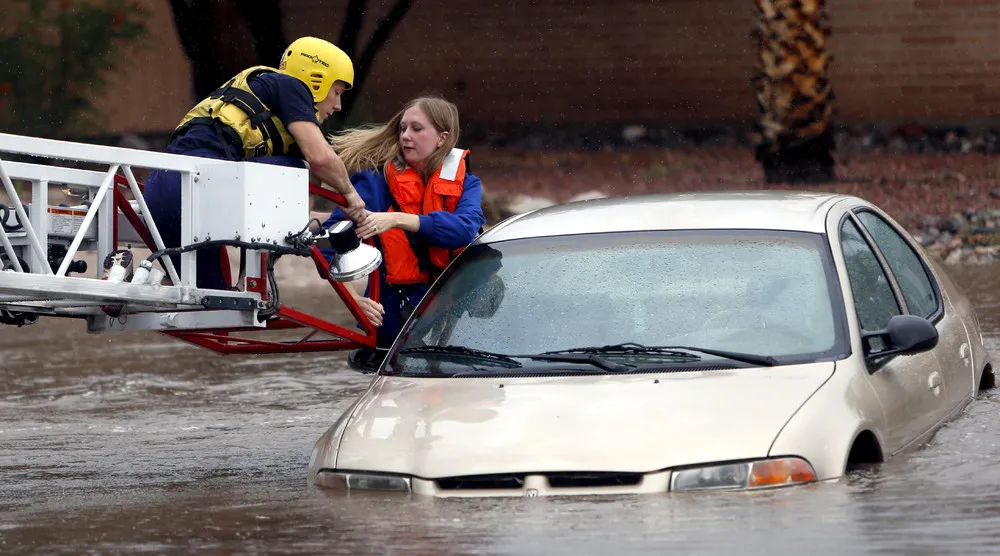 Tucson Fire Department personnel use a ladder truck to rescue a woman from a car stranded in rising flood waters in east Tucson, Ariz., Tuesday, August 19, 2014. (Photo by Kelly Presnell/AP Photo/Arizona Daily Star)