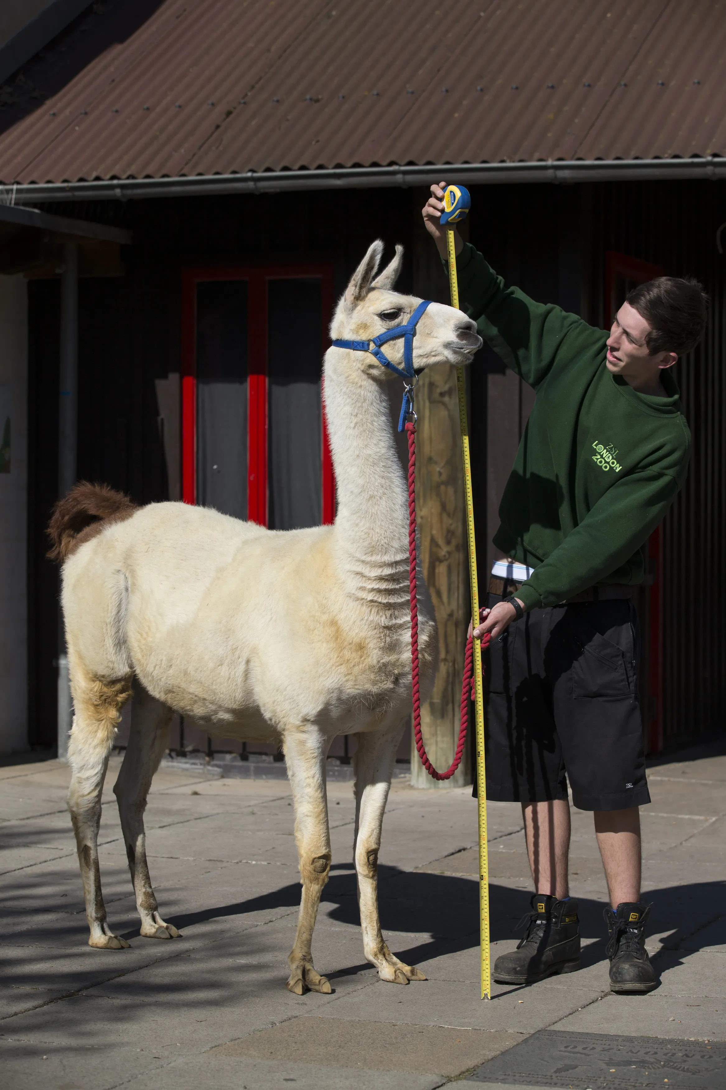 Keeper Jack Sargent measures Perry, a 6ft llama, during the annual weight-in ZSL London Zoo on August 21, 2014 in London, England. The height and mass of every animal in the zoo, of which there are over 16,000, is recorded and submitted to the Zoological Information Management System. This is combined with animal measurement data collected from over 800 zoos and aquariums in almost 80 countries, from which zoologists can compare information on thousands of endangered species. (Photo by Oli Scarff/Getty Images)