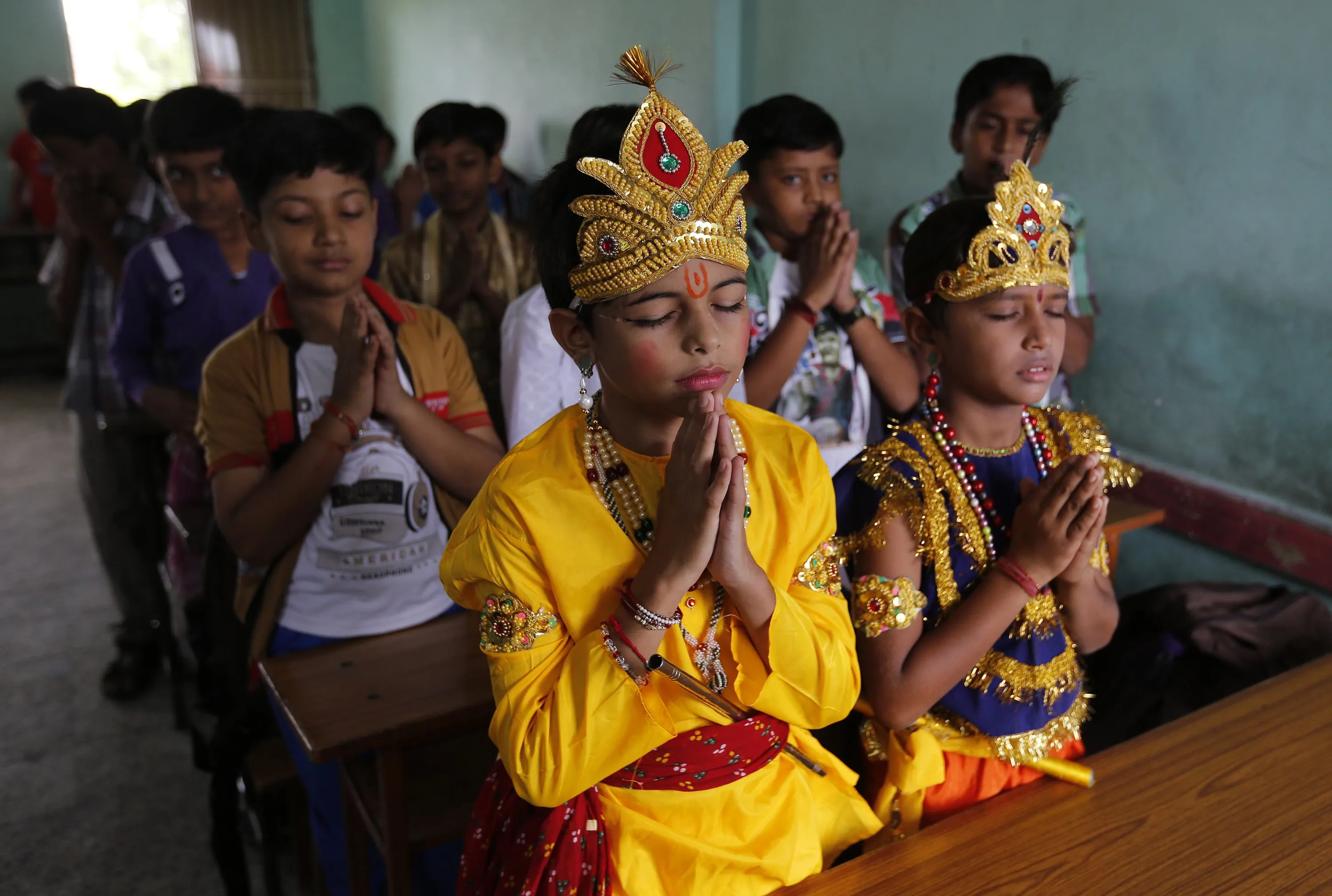 Students dressed as Hindu Lord Krishna (C) and his consort Radha (R) offer school prayers inside their classroom during celebrations marking the Janmashtami festival in the western Indian city of Ahmedabad August 16, 2014. The festival, which marks the birth anniversary of Lord Krishna, will be celebrated across India on Monday. (Photo by Amit Dave/Reuters)