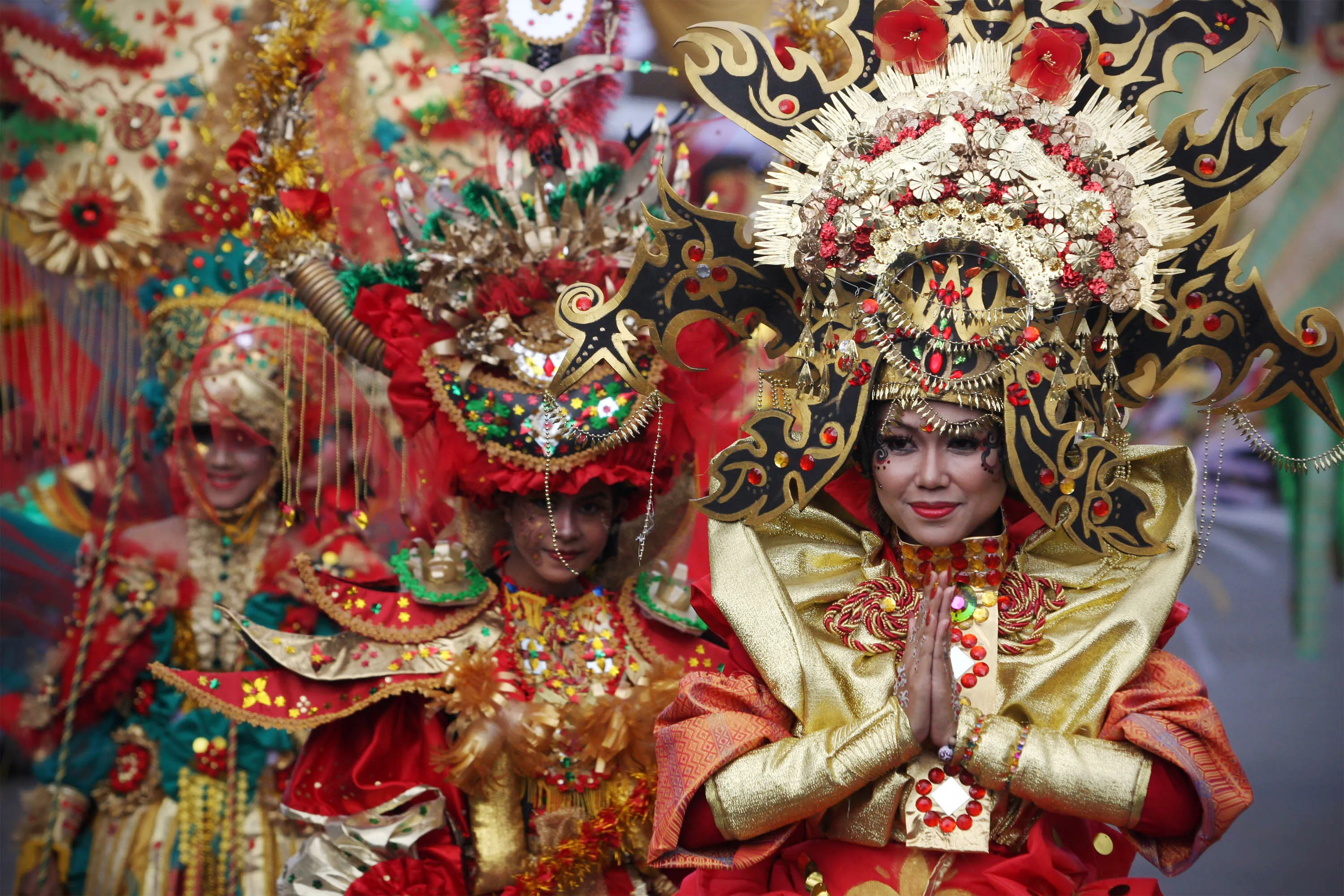 Models showcase a design on the catwalk during the eighth Jember Fashion Carnival on August 2, 2009 in Jember, East Java, Indonesia. World Unity was the theme for this year's carnival, which featured more than 400 models parading along Jember's longest street. (Photo by Ulet Ifansasti/Getty Images)