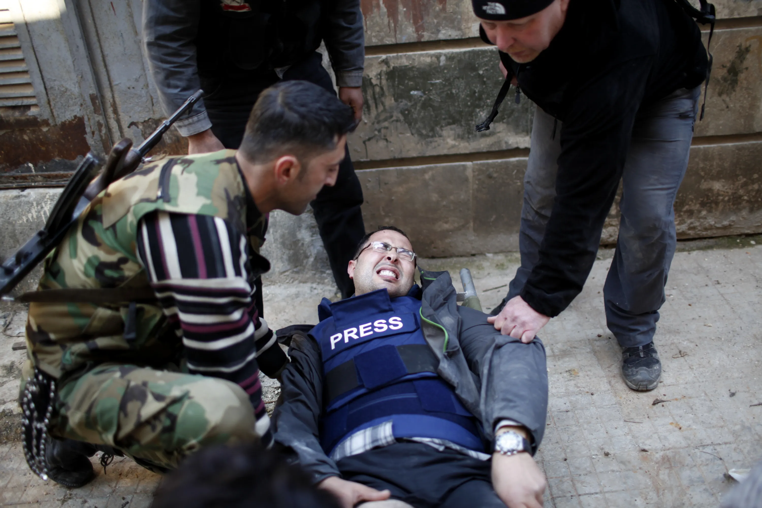 Ayman al-Sahili, a Reuters cameraman, reacts as he was shot in the leg while filming on the front line in Syria's north city of Aleppo by a sniper loyal to Syrian President Bashar el-Assad December, 31, 2012. (Photo by Ahmed Jadallah/Reuters)