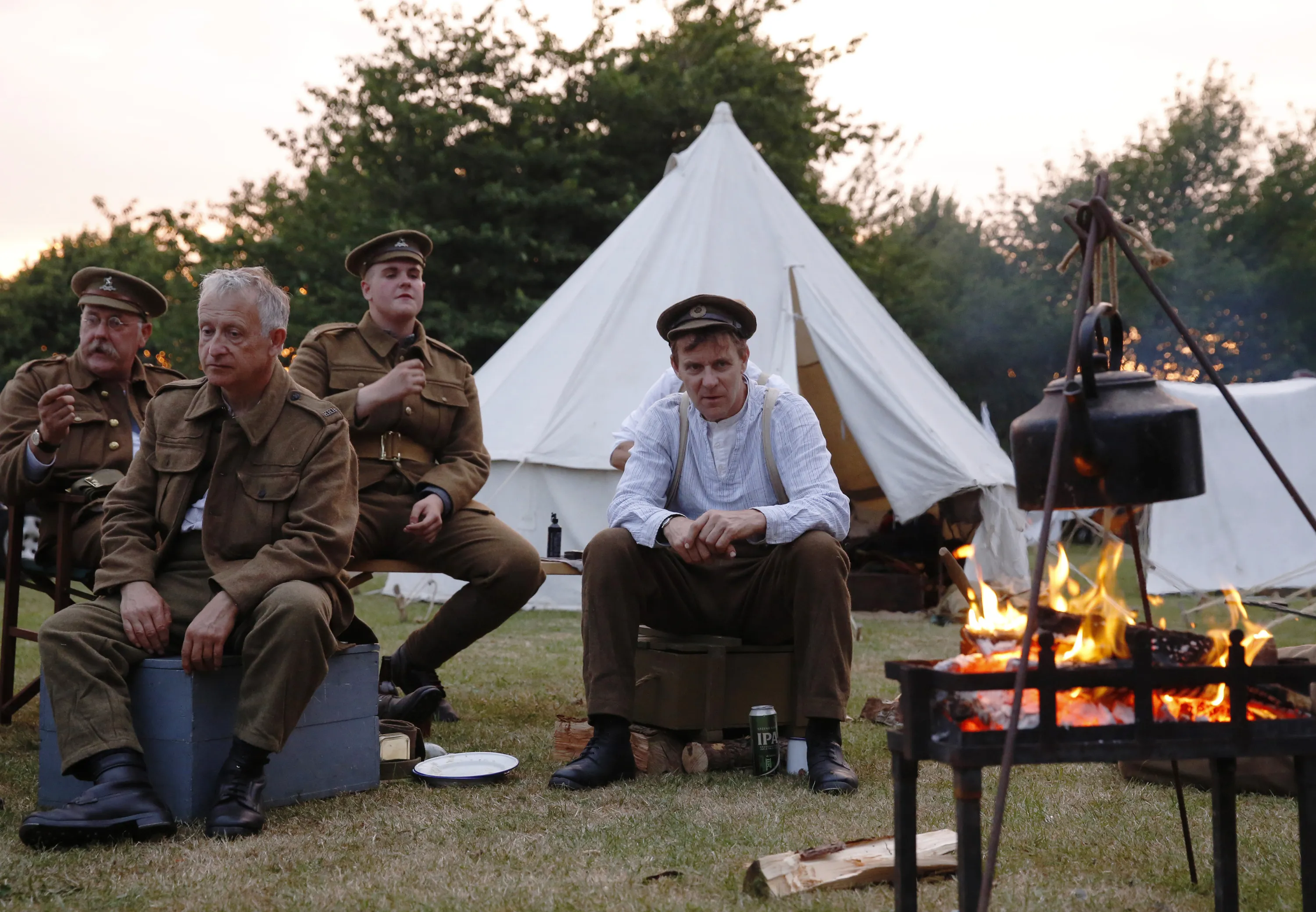 City of Westminster Environmental Health officer Steve Neville (R) portrays a rifleman in the Kings Royal Rifle Corps with the Rifles Living History Society as he recreates the life of a First World War soldier at the Colchester Military Tournament in Colchester, eastern England July 5, 2014. Steve was already a re-enactor of the Napoleonic Wars but decided to move forward in time and concentrate on the First World War, primarily because he had four ancestors who fought in the war. His great-grandfather Patrick Driscoll was killed in the battle of Cambrai, and a great uncle was injured in the Battle of the Somme but survived. His main enjoyment in participating in the re-enactments are “the bangs and smoke”. (Photo by Luke MacGregor/Reuters)