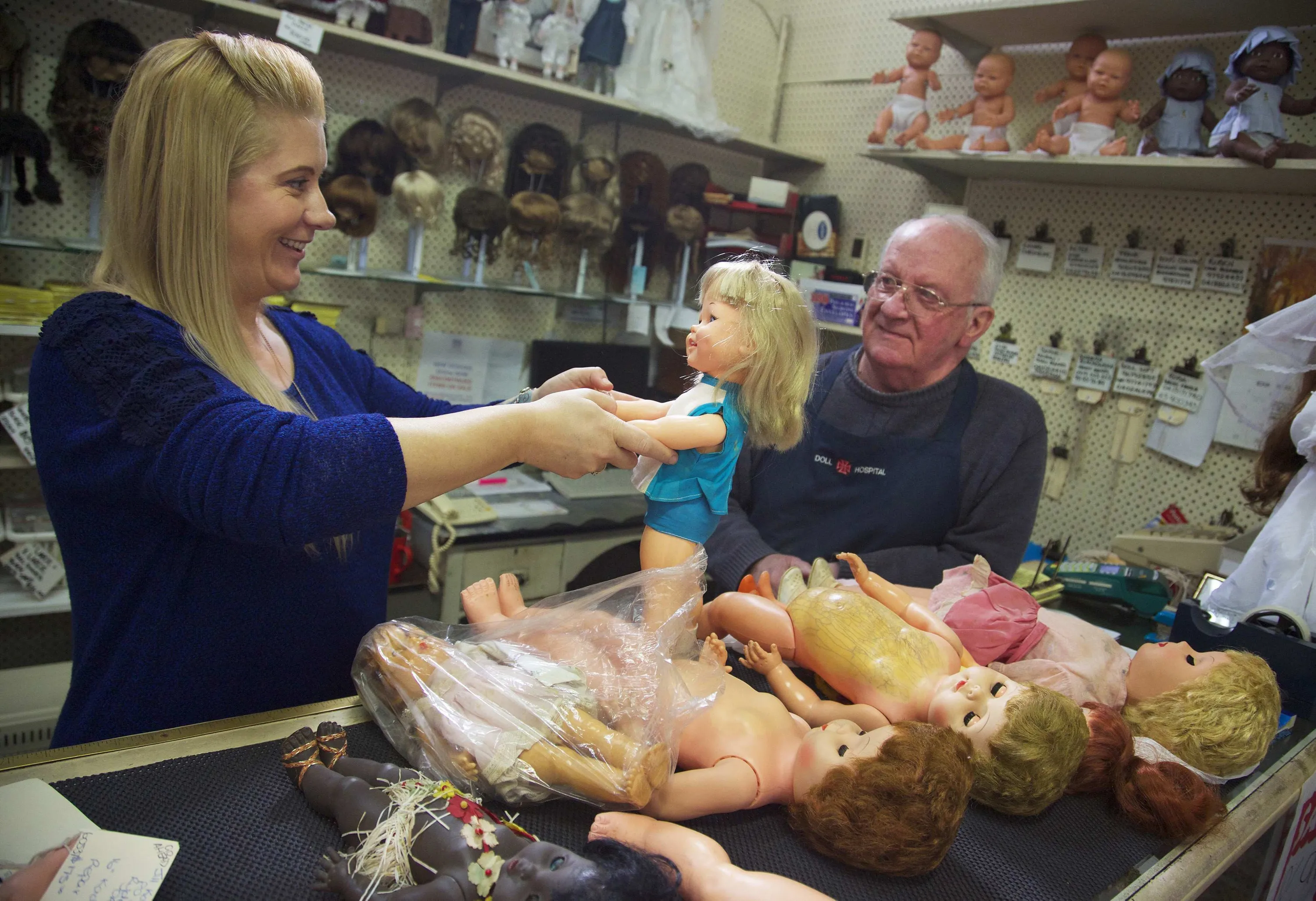 Geoff Chapman (R), “Head Surgeon” and third-generation owner of Sydney's Doll Hospital, is pictured with employee Nadine Kosztka, as they inspect customers dolls that have been brought in for repair, May 20, 2014. Opened in 1913, Sydney's Doll Hospital has worked on millions of dolls, teddy bears and other toys. Behind a toy shop on a busy suburban street in Sydney's south, “doll surgeons” transplant fingers, toes and heads, and repair broken eye sockets in dolls who were the victim of a childhood tantrum or sibling rivalry, sometimes decades ago. (Photo by Jason Reed/Reuters)