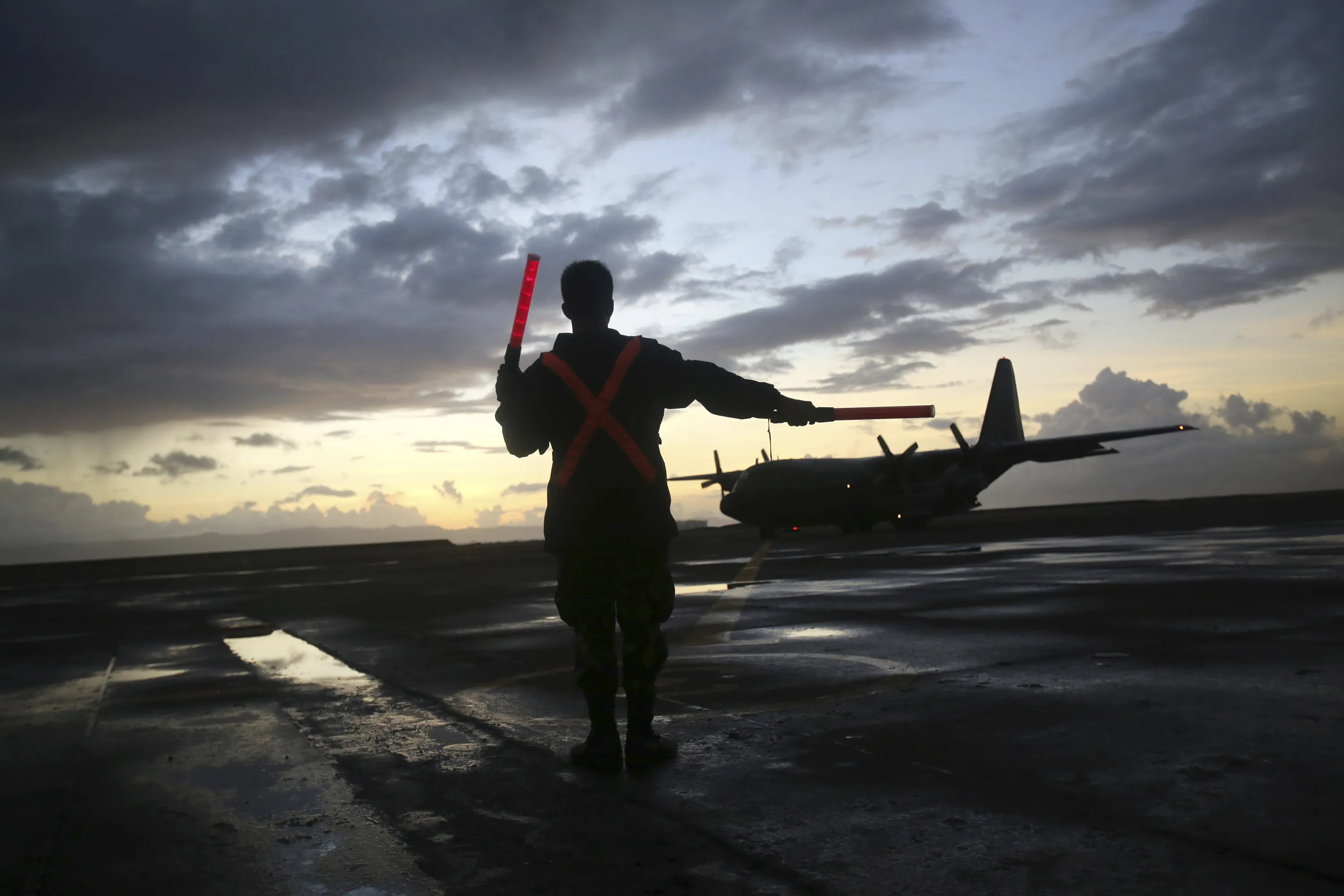 A military C-130 lands to evacuate survivors of Typhoon Haiyan at dusk, Friday, November 15, 2013 in Tacloban city, Leyte province, central Philippines. Typhoon Haiyan, one of the most powerful storms on record, hit the country's eastern seaboard November 8, leaving a wide swath of destruction. (Photo by Wong Maye-E/AP Photo)