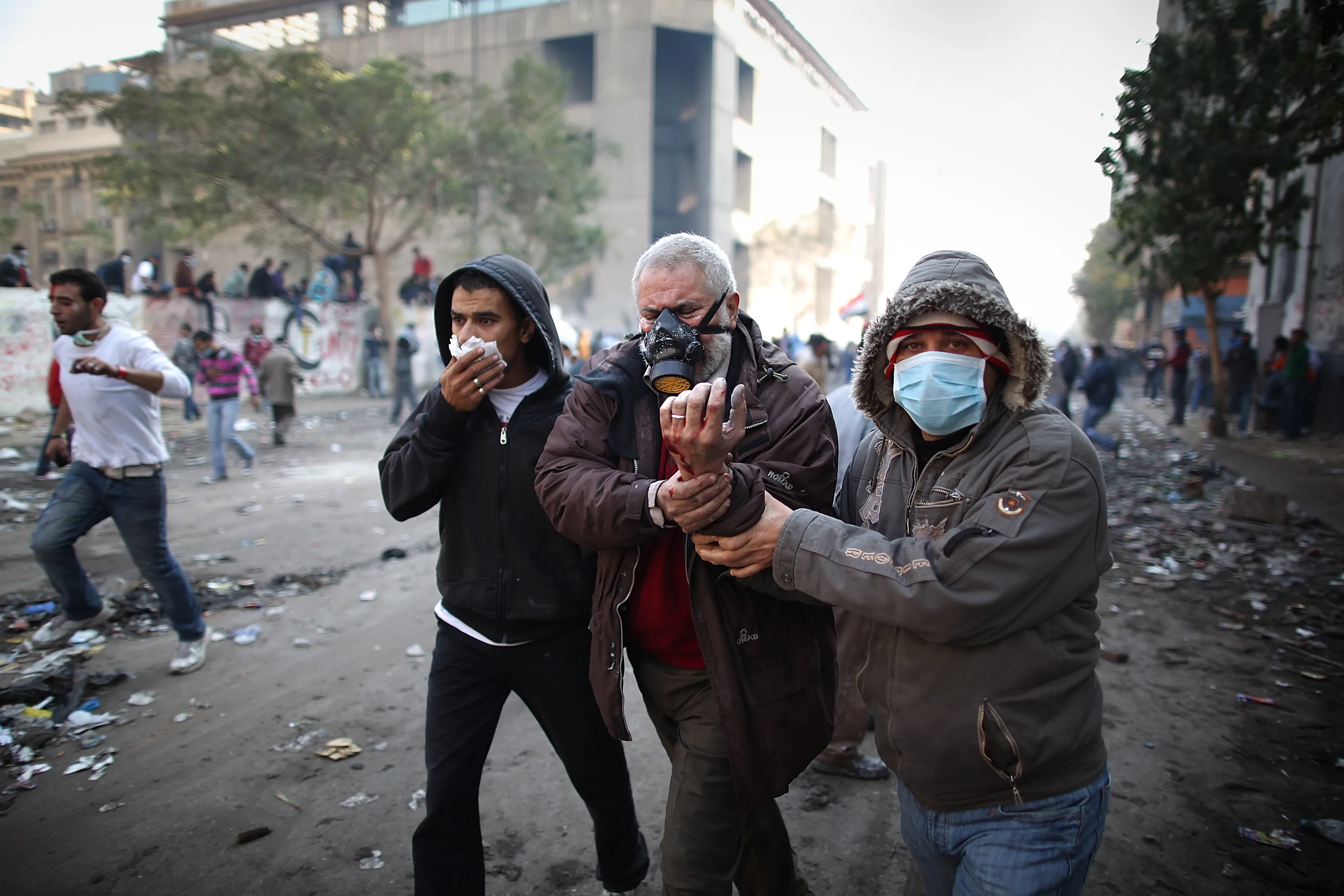An injured protestor is led away during clashes with police near Tahrir Square on November 23, 2011 in Cairo, Egypt. (Photo by Peter Macdiarmid/Getty Images)