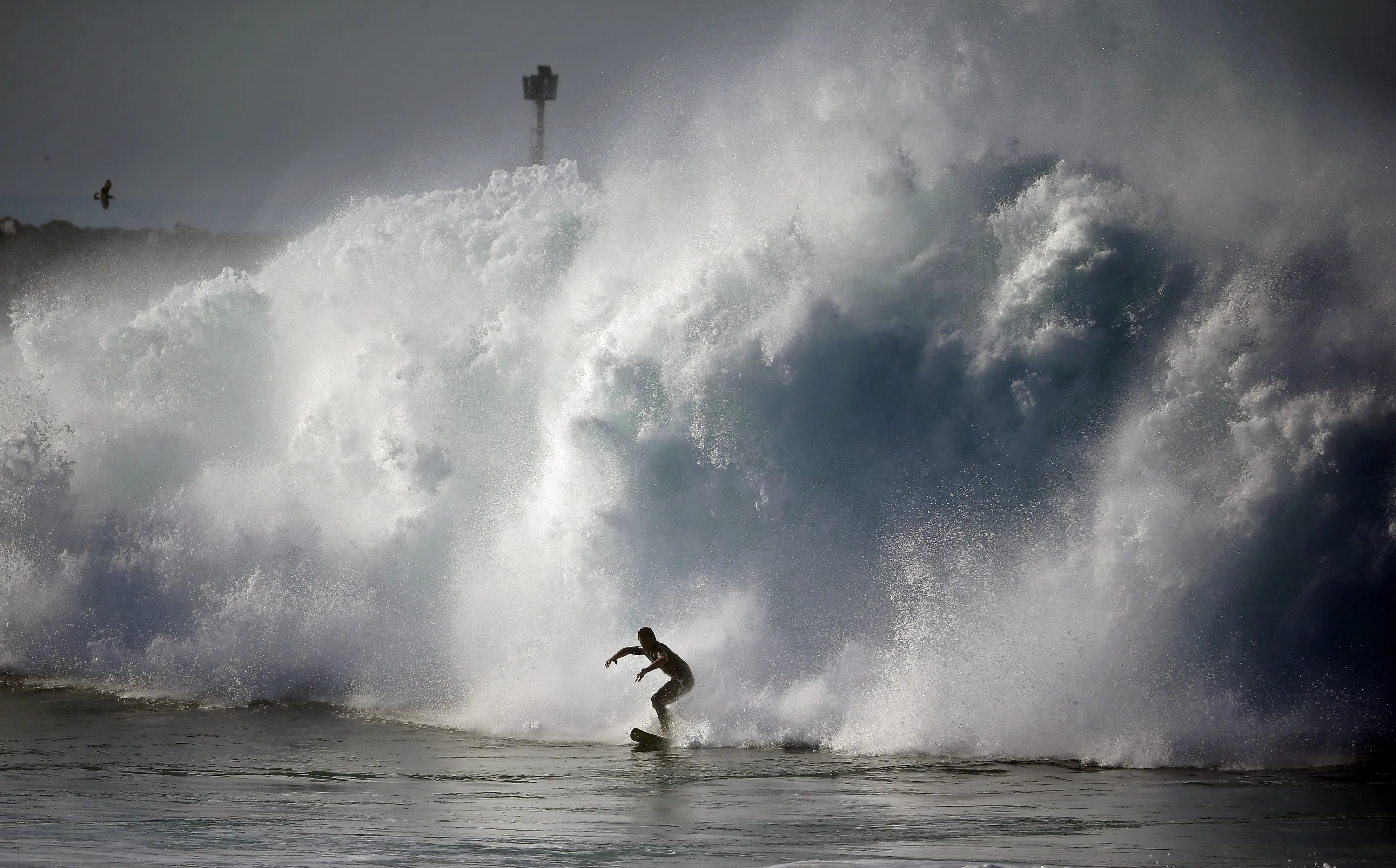 A surfer rides a wave at the wedge in Newport Beach, Calif., Wednesday, August 27, 2014. (Photo by Chris Carlson/AP Photo)