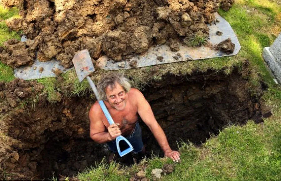 Ray Loxton, 59, was pictured in his local newspaper smiling, while standing topless inside a grave on a hot summers day.