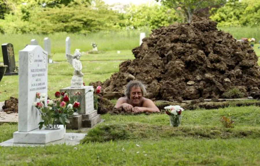 Ray Loxton, 59, was pictured in his local newspaper smiling, while standing topless inside a grave on a hot summers day.