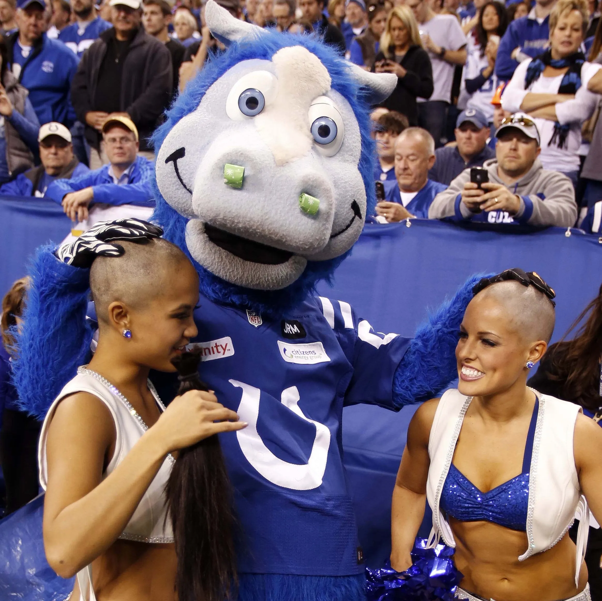 Indianapolis Colts cheerleaders Crystal Ann, left, and Megan get their heads shaved by Colts mascot during a game against the Buffalo Bills at Lucas Oil Stadium, 2012-11-25. The cheerleaders raised over $22,670 for cancer research in support of Colts coach Chuck Pagano who has leukemia. (Photo by Brian Spurlock/US Presswire)