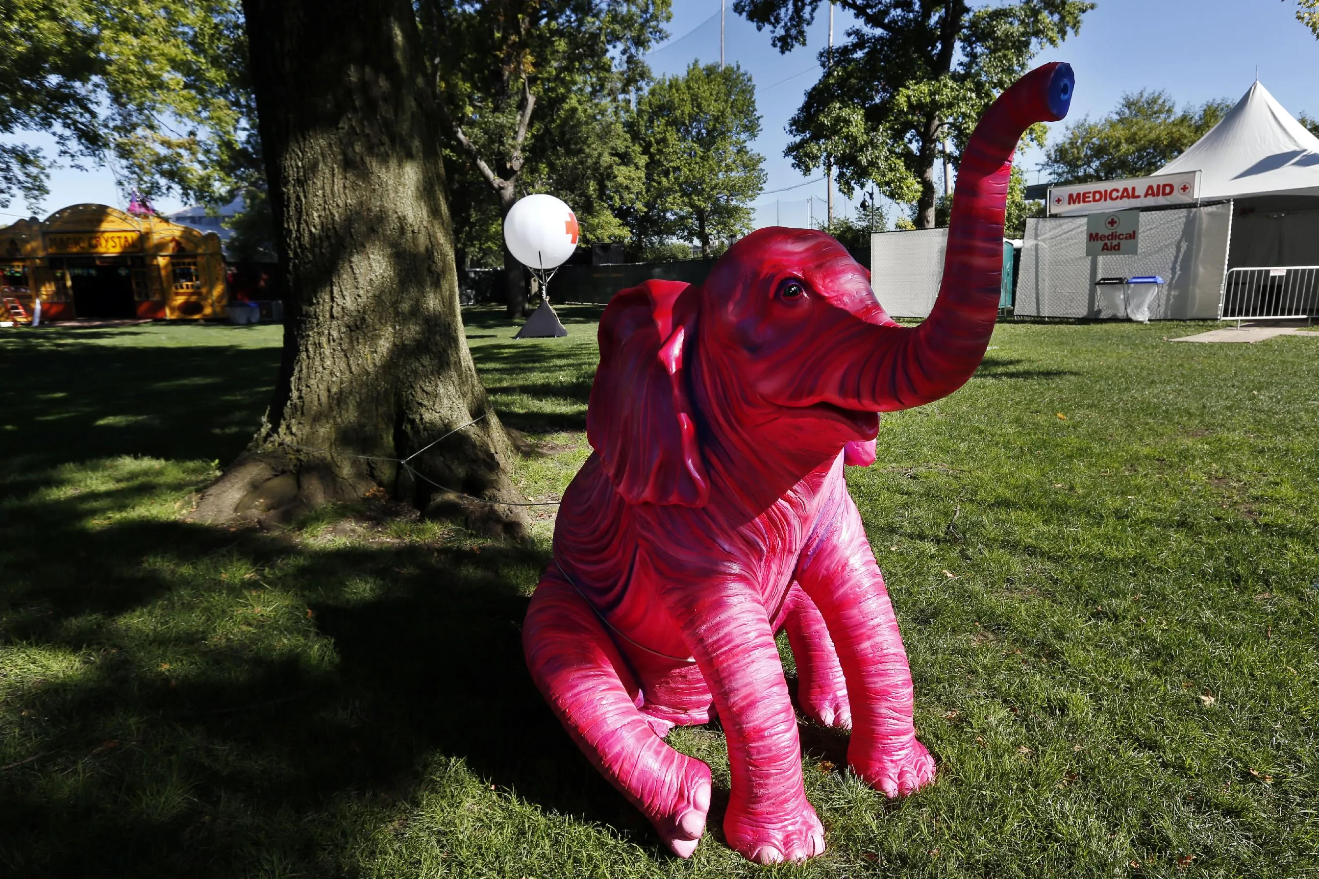 A pink elephant sculpture sits adjacent to a medical tent at the Electric Zoo music festival venue on New York's Randall's Island, Friday, August 29, 2014. The final day of last year's festival was called off after two people died from an overdose of MDMA combined with hyperthermia. (Photo by Jason DeCrow/AP Photo)