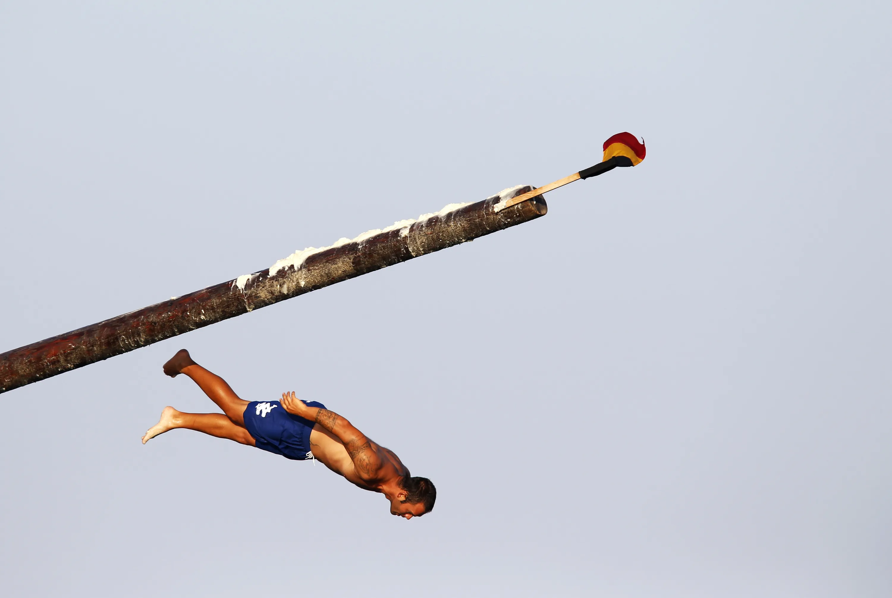 A man slips off the “gostra”, a pole covered in grease, during the week-long celebrations for the religious feast of St Julian, patron of the town of St Julian's, outside Valletta August 24, 2014. In the traditional “gostra”, a game stretching back to the Middle Ages, young men, women and children have to make their way to the top of a pole and try to uproot one of the flags to win prizes. From May to September in Malta, there is hardly any weekend when a town or a village is not celebrating the feast of its patron saint or other saints revered in different churches. (Photo by Darrin Zammit/Reuters)