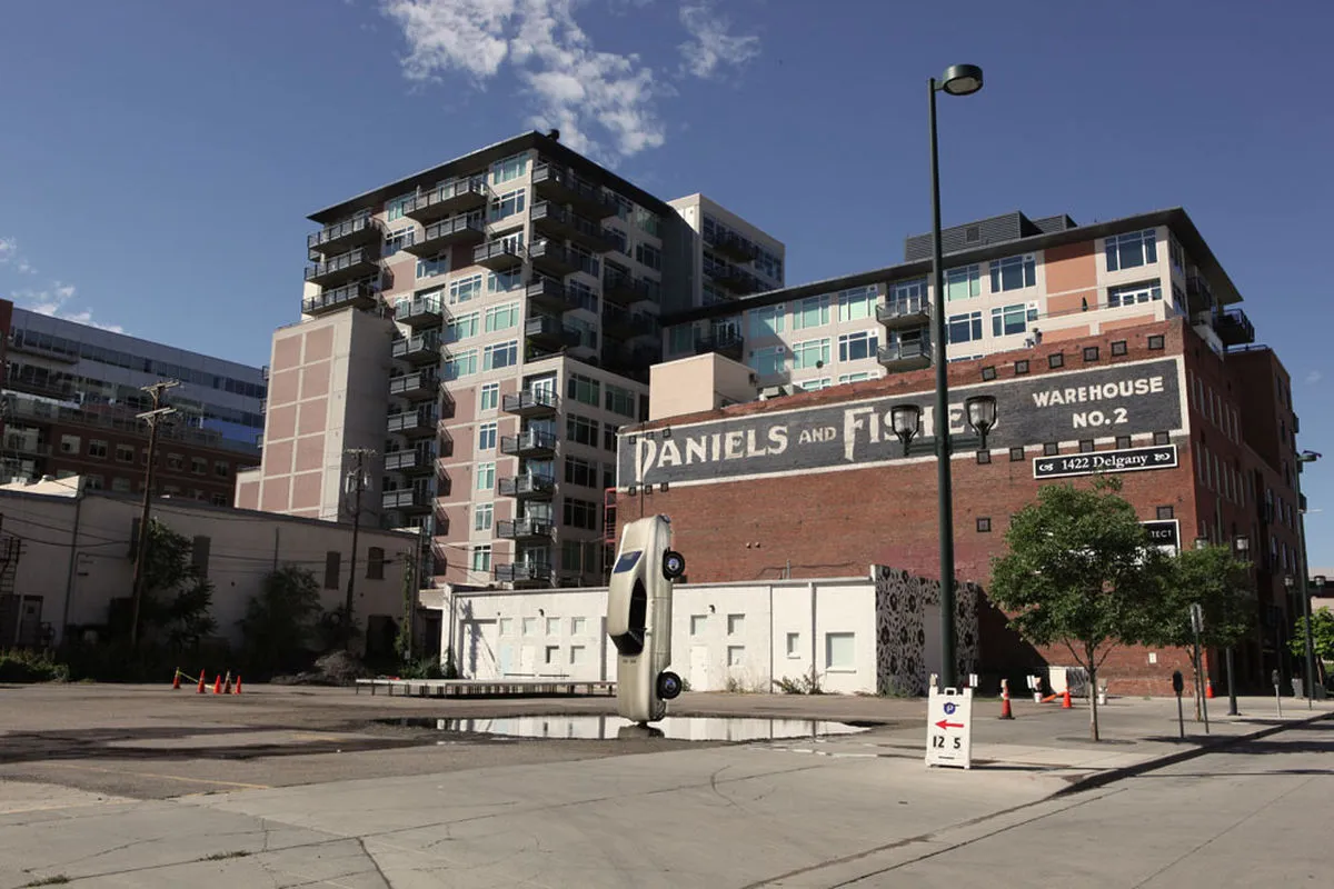 Guadalajara-based artist Gonzalo Lebrija created a public art installation in the parking lot (1430 Delgany Street, Denver, CO 80202) across from the Museum of Contemporary Art Denver (MCA Denver) in the summer of 2010. The installation, entitled History of Suspended Time: Monument for the Impossible, was developed as a dual collaboration with MCA Denver's museum-wide exhibition, Energy Effects: Art & Artifacts from the Landscape of Glorious Excess, as well as Denver's inaugural 2010 Biennial of the Americas, an international event that celebrated the culture, ideas and people of the Western Hemisphere. Lebrija's History of Suspended Time marked the physical and permanent realization of an earlier performance during which the artist hoisted a restored muscle car above a lake with a crane and then dropped the car into the water while filming it with a high-speed camera. Lebrija's camera caught the moment just before the car broke the lake's surface. While in reality the car was in motion, in the image it appears to be suspended in time, an illusion made monumental in Gonzalo's subsequent installation. A massive car delicately poised on the surface of the water, History of Suspended Time appears to defy gravity and stop time. In addition to creating an uncanny–even sublime–effect, the installation encourages visitors to think about the automobile as a symbol of modern life and human aspiration. Furthermore, the work represents a more complex discussion of energy beyond the popular topic of conservation. In Lebrija's original performance, the artist spent months fixing up a car only to drop it into a lake. With this glorious excess, Lebrija's monumental sculpture explores the complicated relationship between excessive energy and artistic production. Gonzalo Lebrija