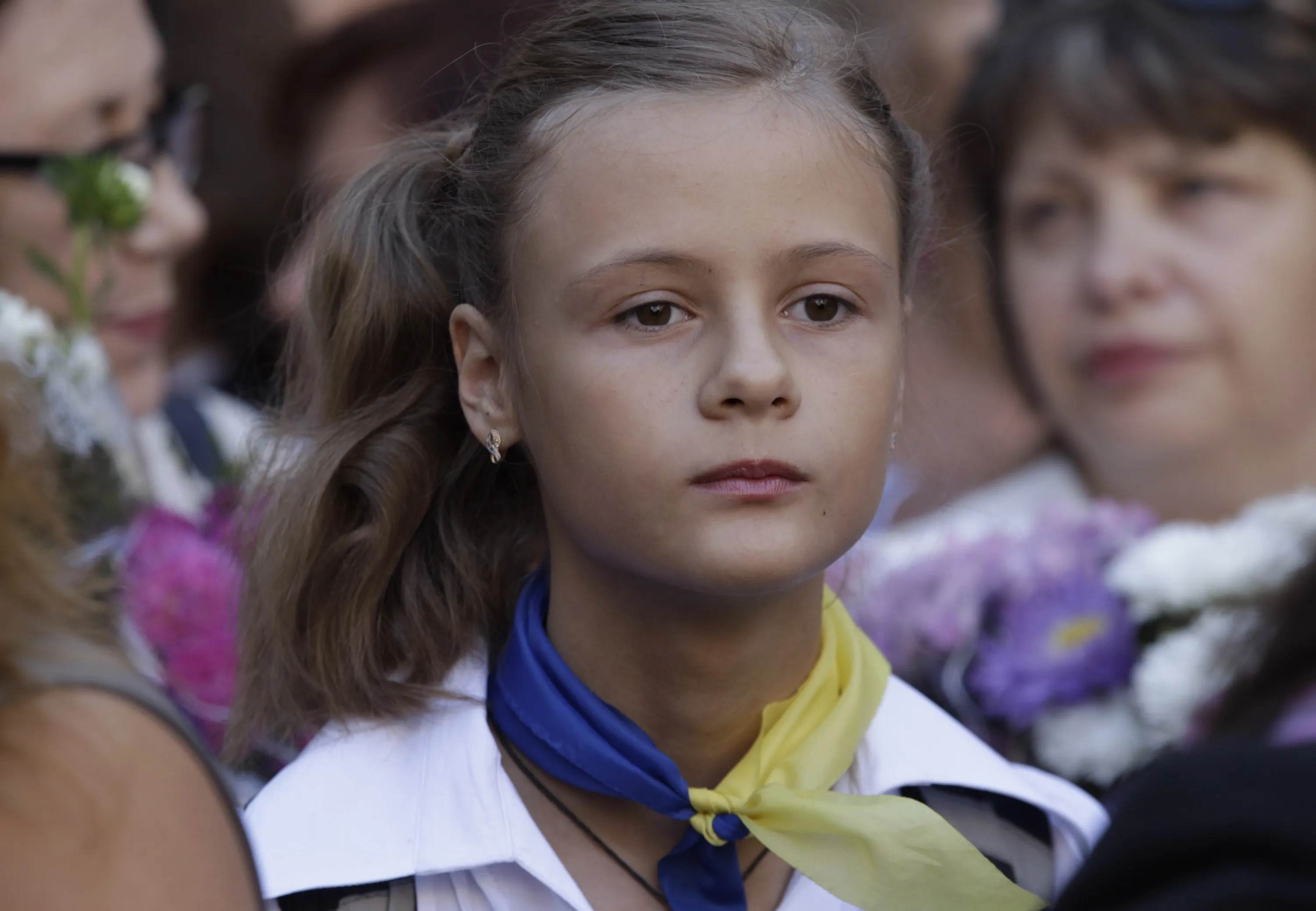 A schoolgirl attends morning assembly in a school in the southern coastal town of Mariupol, September 1, 2014. September 1 marks the start of a new academic year for students in Ukraine. (Photo by Vasily Fedosenko/Reuters)