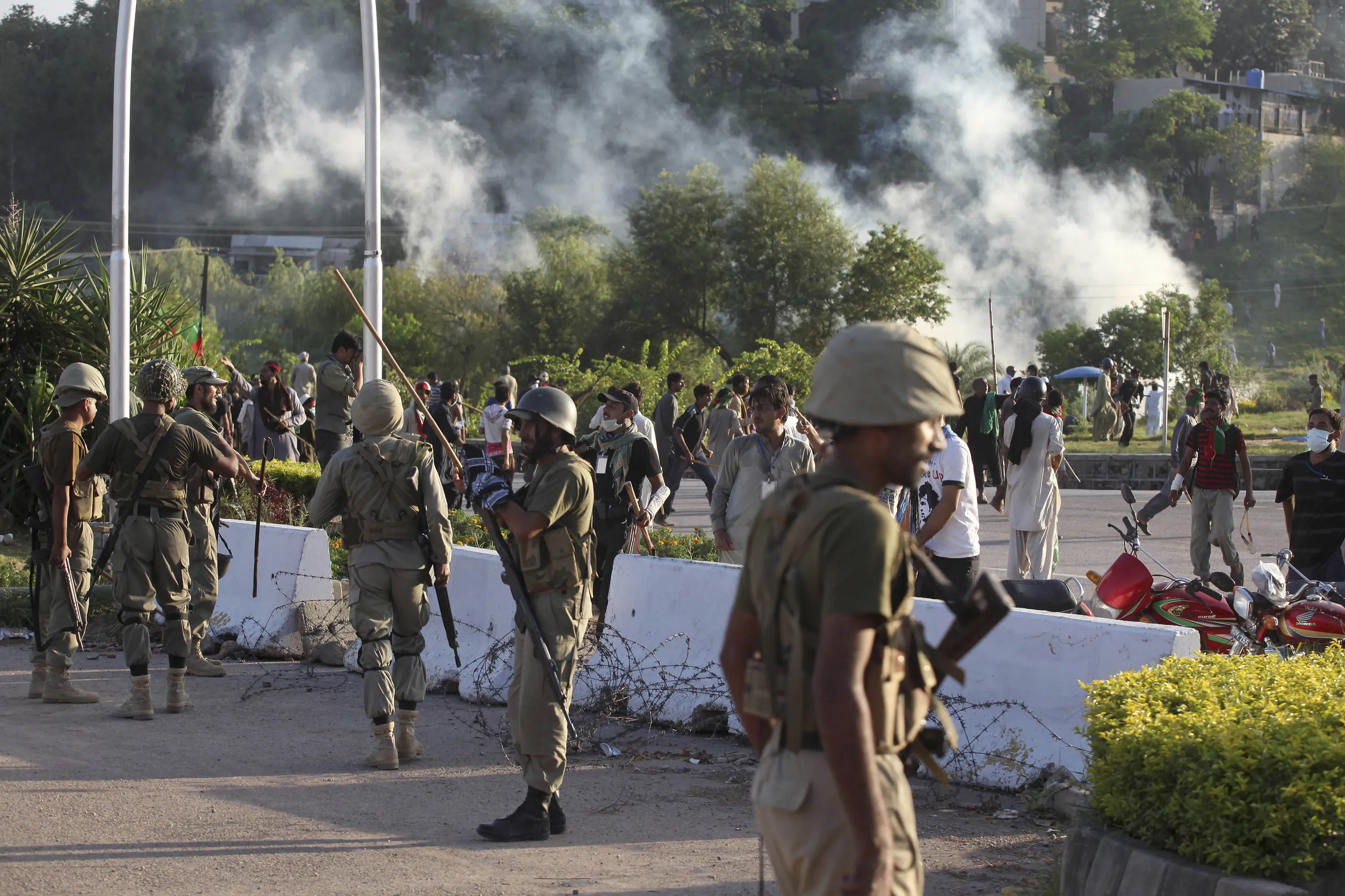 Pakistani paramilitary troops stand guard during a clash between police and protesters in Islamabad, Pakistan, Monday, September 1, 2014. Anti-government protesters stormed Pakistan's state television building Monday, forcing the channel briefly off the air as they clashed with police and pushed closer to the prime minister�s residence. The violence comes as part of the mass demonstrations led by cleric Tahir-ul-Qadri and opposition politician Imran Khan that demand Prime Minister Nawaz Sharif resign. (Photo by Anjum Naveed/AP Photo)