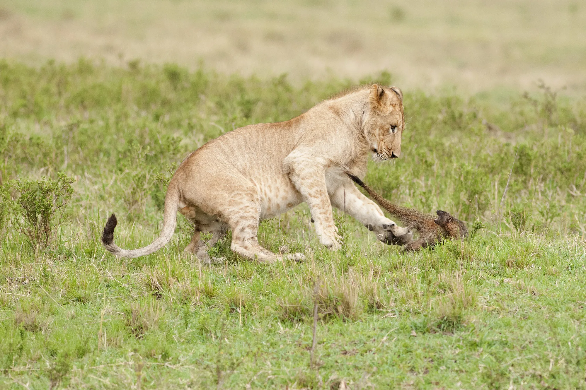 A lion almost catches the mongoose on September 10, 2011 in Maasai Mara, Kenya. Four lions were left with their tails between their legs when a mongoose bravely took on the predators. Despite being under two feet tall, the aggressive mongoose growled at the felines and even bit one on the nose. The shocking fight, which was photographed in 2011 but has just been released, began in the Masaai Mara National Park, Kenya, when photographer Jerome Guillaumot came across four young lions surrounding the terrified marsh mongoose. The lions chased the mongoose into a hole in the ground but the small animal reemerged to fight the predators once again before running for cover. (Photo by Jerome Guillaumot/Barcroft Media)