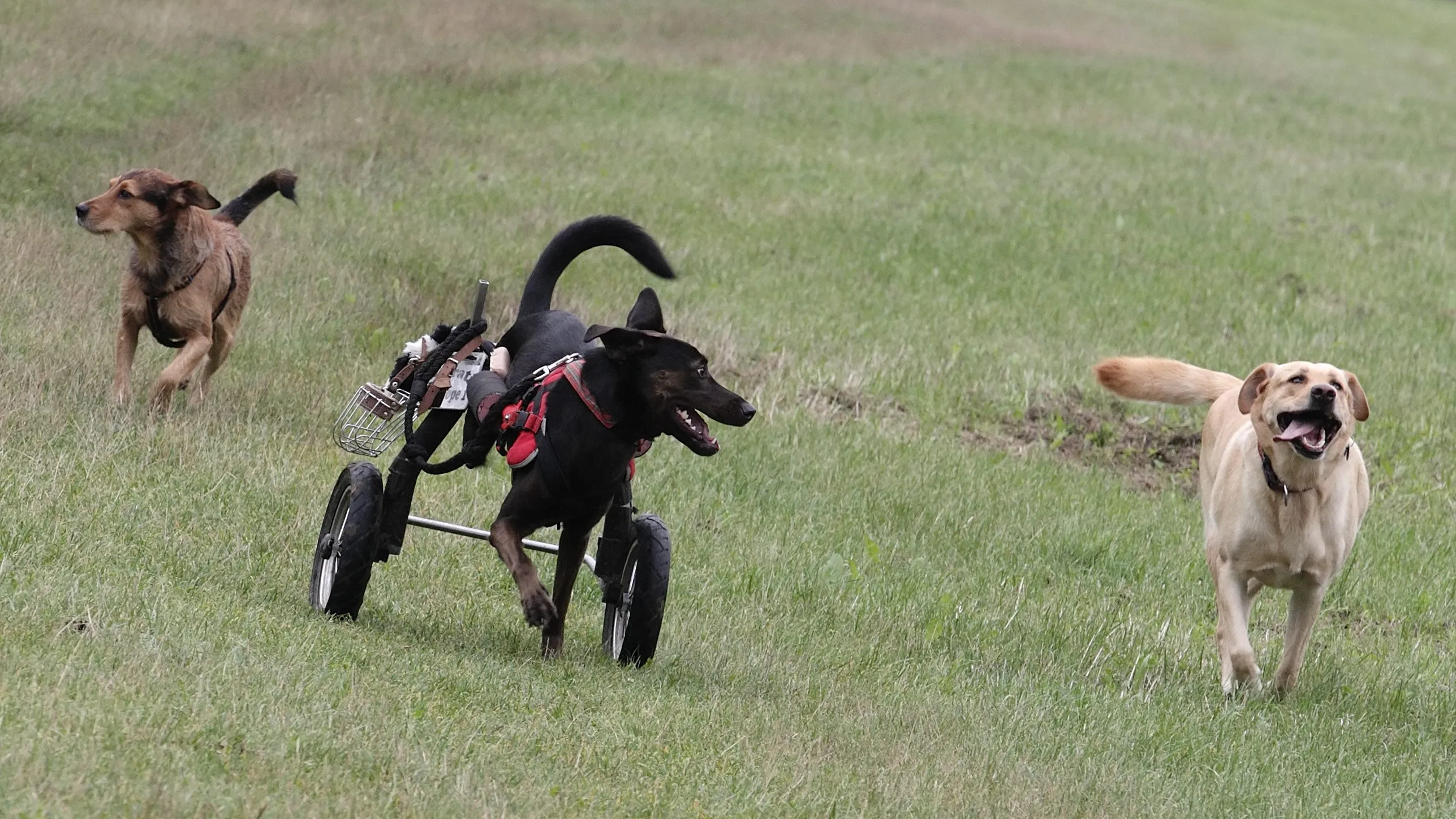 Three-years-old dog Hope (C) runs using a wheelchair amongst other dogs in Vienna September 3, 2014. (Photo by Heinz-Peter Bader/Reuters)