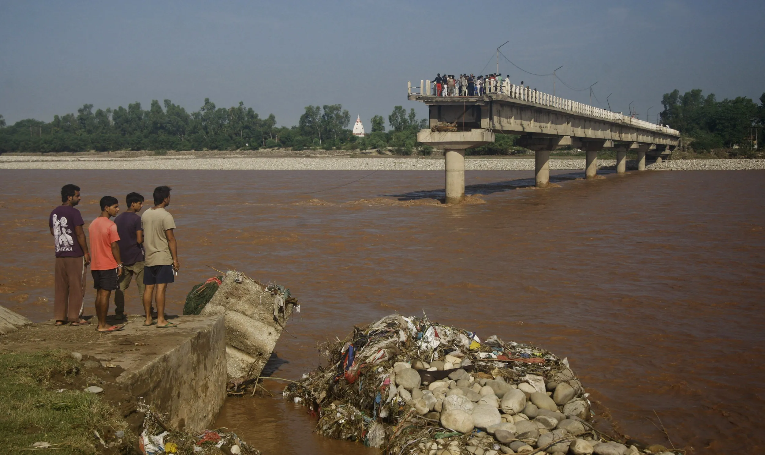 People look at a bridge across the Tawi River that was damaged in the floods at Mandal village on the outskirts of Jammu, India, Sunday, September 7, 2014. The flooding, the worst in 50 years, has killed more than a hundred people across the Himalayan region. (Photo by Channi Anand/AP Photo)