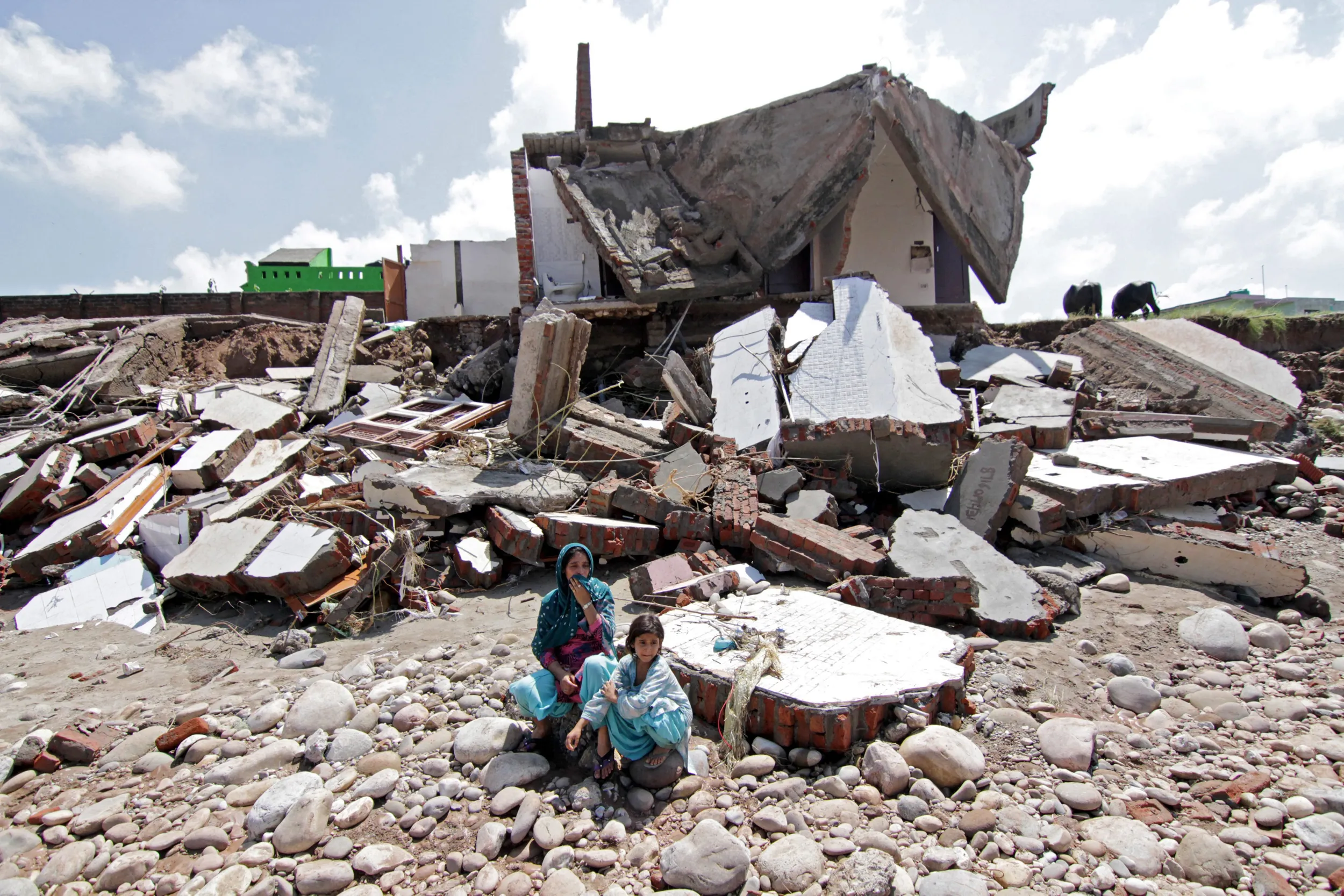 Indian woman along with her child sit outside her destroyed house during flash floods in Jammu, the winter capital of Kashmir, India, 07 September 2014. The death toll neared 150 in floods brought on by heavy rains that left thousands homeless in India's northern state of Jammu and Kashmir. Large parts of Srinagar, capital of Jammu and Kashmir, was inundated, with people shifting to roofs and higher floors. (Photo by Jaipal Singh/EPA)