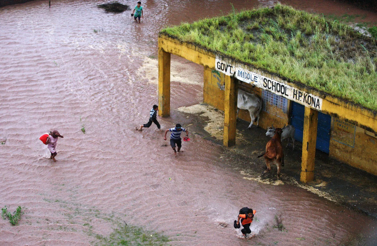 In this handout photograph received from the Ministry of Defence on September 6, 2014, Kashmiri residents run as an unseenIndian Army helicopter takes part in rescue operations during flooding at Hamirpur Kona in the Rajouri district of the state of Jammu and Kashmir. More than 230 people in Pakistan and northern India have been killed in torrential monsoon rains which triggered flooding, landslides and house collapses, officials in the two countries said September 2. Troops and other emergency personnel were deployed in both countries to help with relief operations, with boats and helicopters being used to reach stranded people. (Photo by AFP Photo/Indian Ministry of Defence)