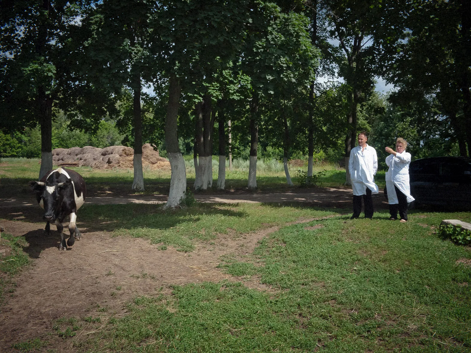 Doctors stand near a cow at the farm. (Photo by Anastasia Rudenko)