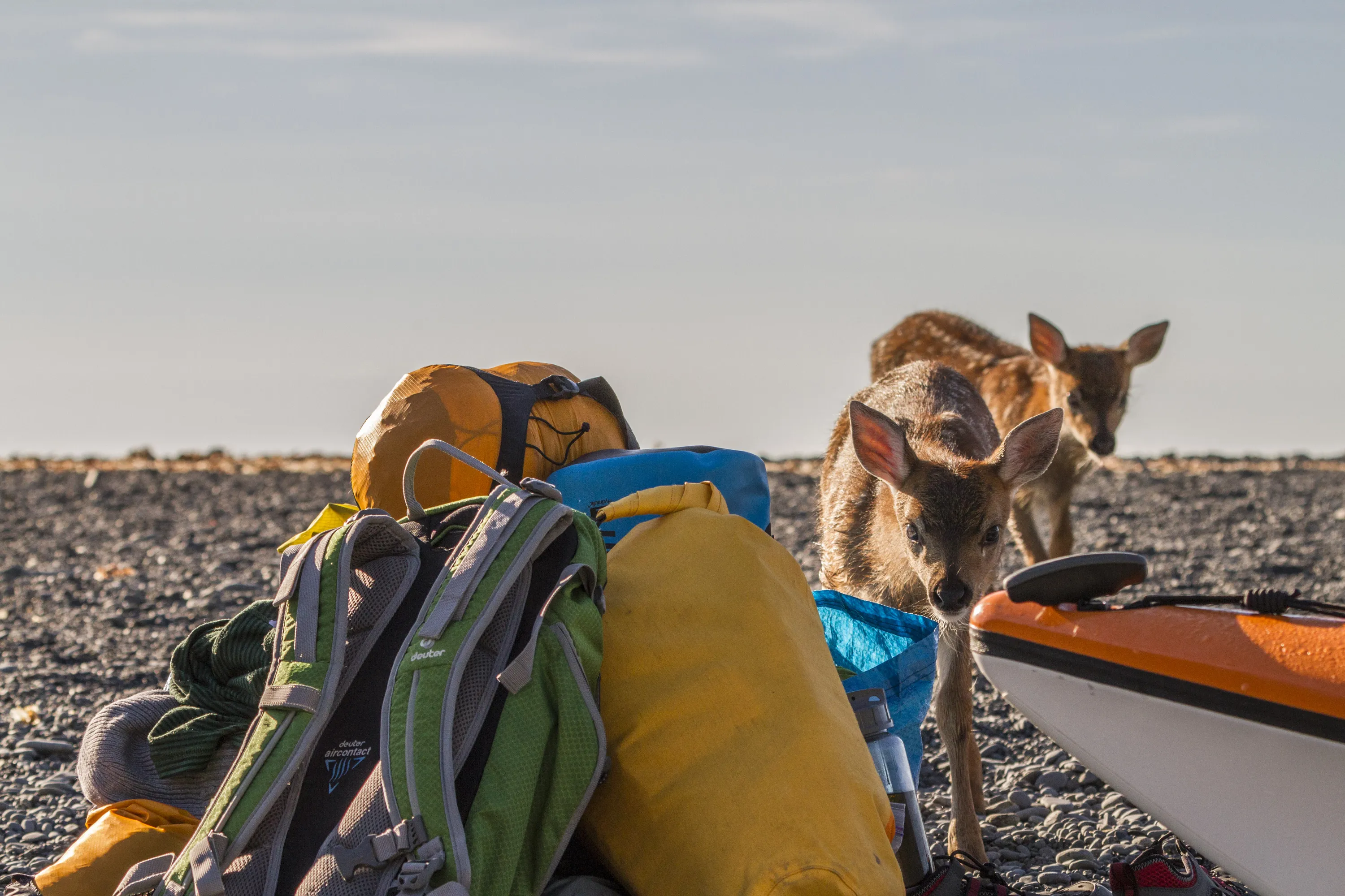 Black sitka deer inspects Daniel Fox's camp, in July 2014, in Kodiak Island, Alaska. Driving in an open-roofed jeep is no longer the fashionable way to see wildlife – as this adventurer shows. A keen wildlife photographer has circled islands in the south of Alaska, the United States, in a kayak to see spectacular scenery and animals. Daniel Fox, 40, from San Francisco spent three months travelling around the islands by kayak, meeting sea lions and brown bears along the way. (Photo by Daniel Fox/Barcroft Media)