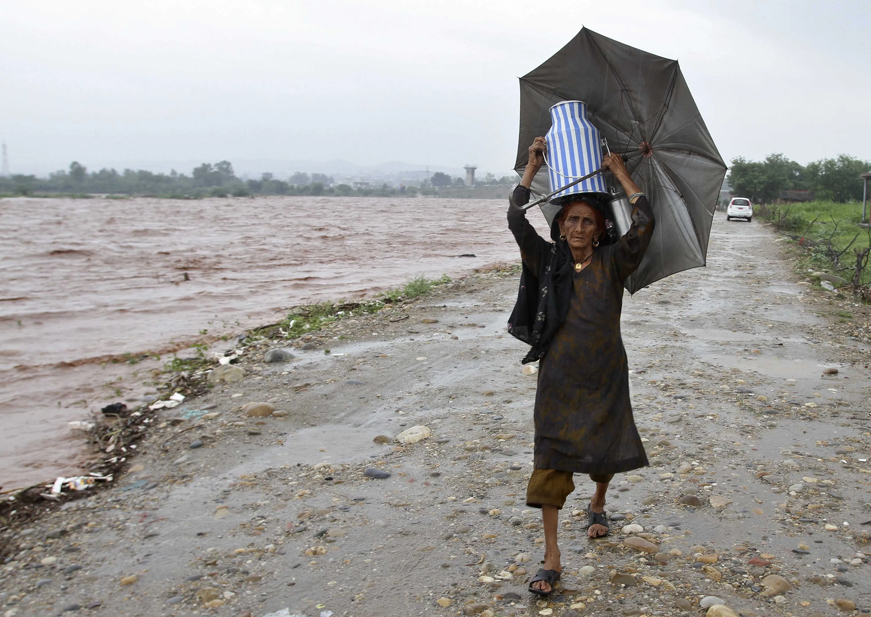 A nomadic woman carries a milk container while shifting her belongings to a safer place from the flooded banks of river Tawi after heavy rains in Jammu September 5, 2014. Sixty-five people were killed after heavy rains caused flash floods in Indian-administered Kashmir, including a wedding party on a bus that was swept away, officials said on Thursday. Authorities declared a disaster alert in the northern region after two days of heavy rain hit villages across the Kashmir valley, causing the worst flooding in two decades. (Photo by Mukesh Gupta/Reuters)
