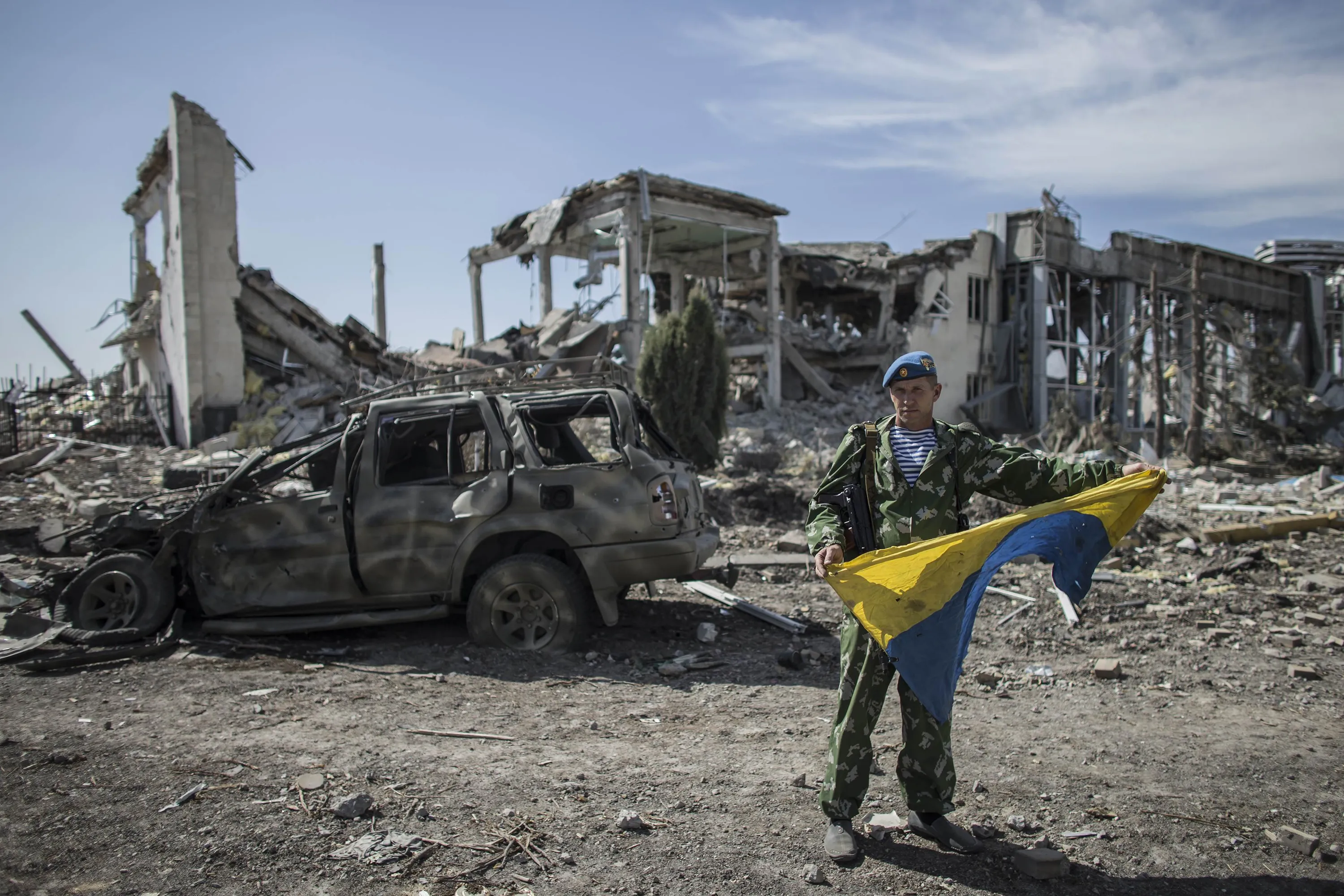 A pro-Russian rebel displays a captured Ukrainian flag at the destroyed airport in Luhanks, eastern Ukraine, September 14, 2014. (Photo by Marko Djurica/Reuters)