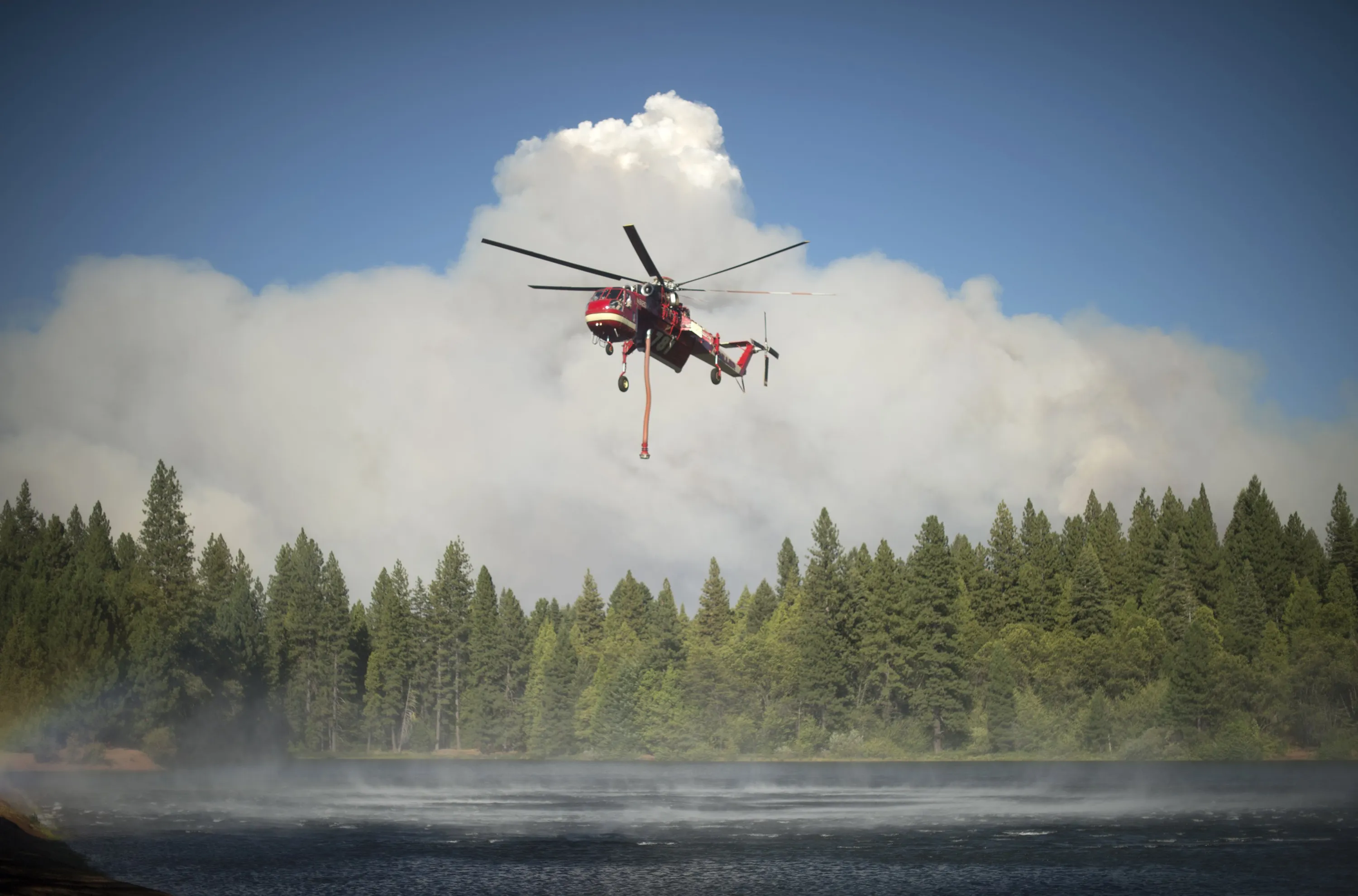 A helicopter draws water from a lake as smoke rises from the King Fire in Pollock Pines, California September 17, 2014. (Photo by Noah Berger/Reuters)