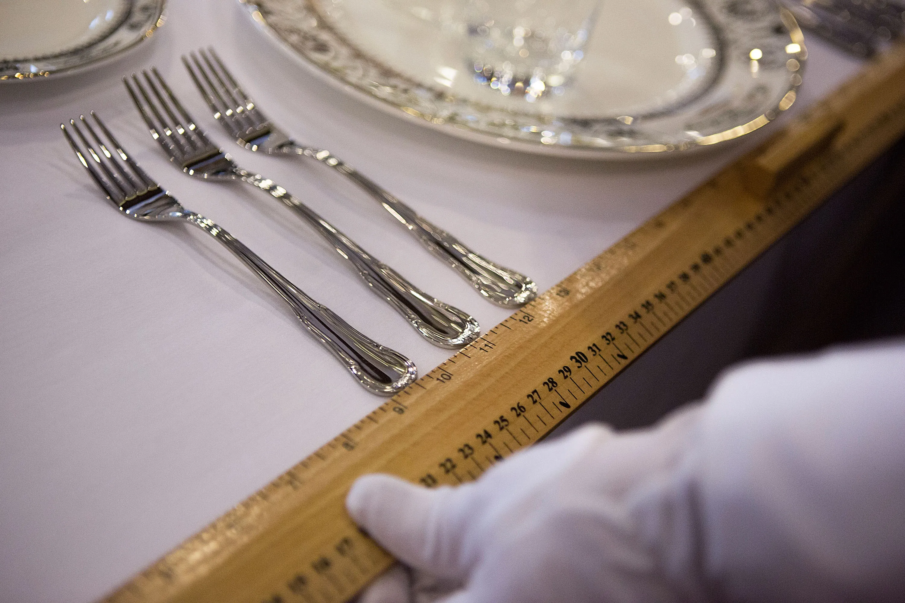 A student uses a ruler to measure the distance between forks before a formal dinner at The International Butler Academy China on September 16, 2014 in Chengdu, China. (Photo by Taylor Weidman/Getty Images)