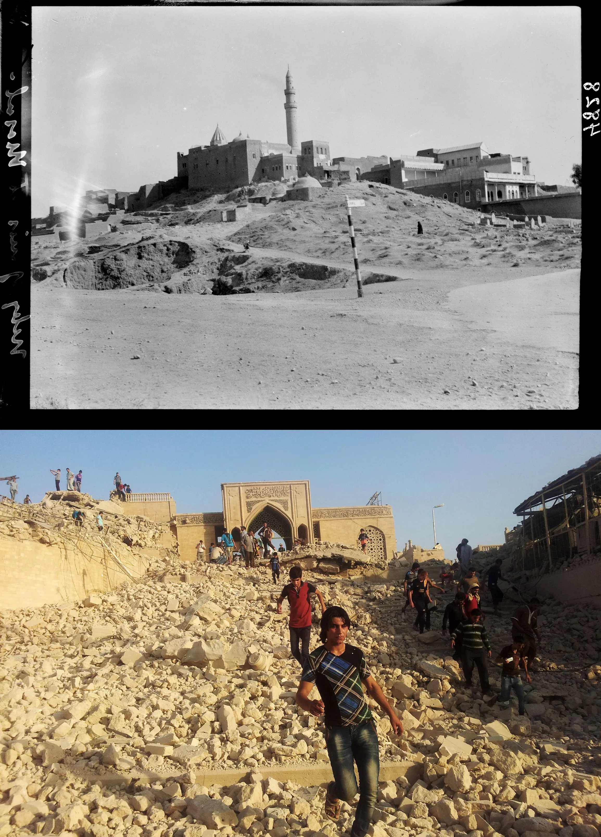 This combination of two photographs shows a 1932 image taken during the autumn of Nebi Yunis, the tomb of the prophet Jonah, in Mosul, northern Iraq, from the Library of Congress, top, and Iraqis walking in the rubble of the revered Muslim shrine after it was was destroyed on Thursday, July 24, 2014 by militants who overran the city in June and imposed their harsh interpretation of Islamic law. Iraq's second largest city, Mosul, is now locked under the rule of extremists from the Islamic State group trying to purge it of everything they see as contradicting their stark vision of Islam. (Photo by AP Photo)