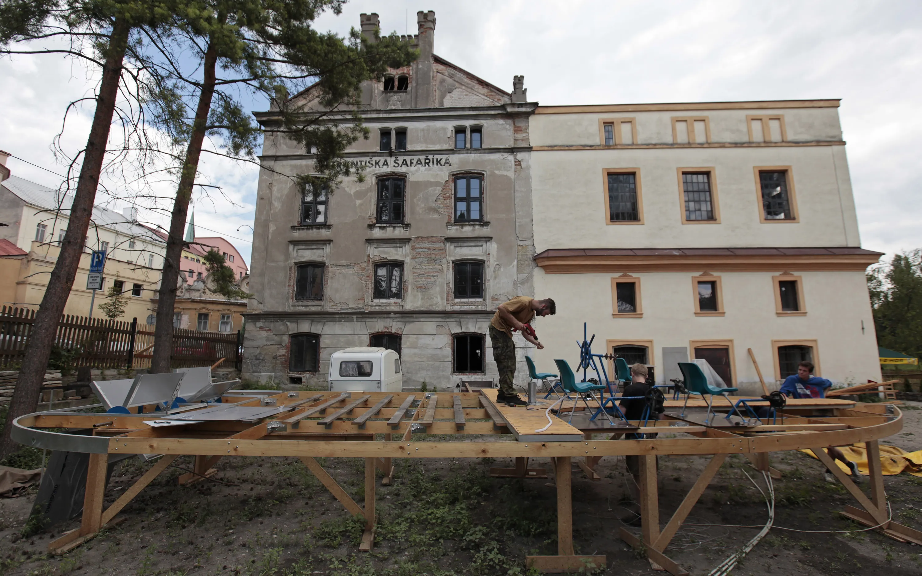 (L-R) Jan Holan, Jakub Bures and Jan Kara attach plastic garden chairs to a wooden frame as they build a boat in their yard in Nymburk July 1, 2014. (Photo by David W. Cerny/Reuters)