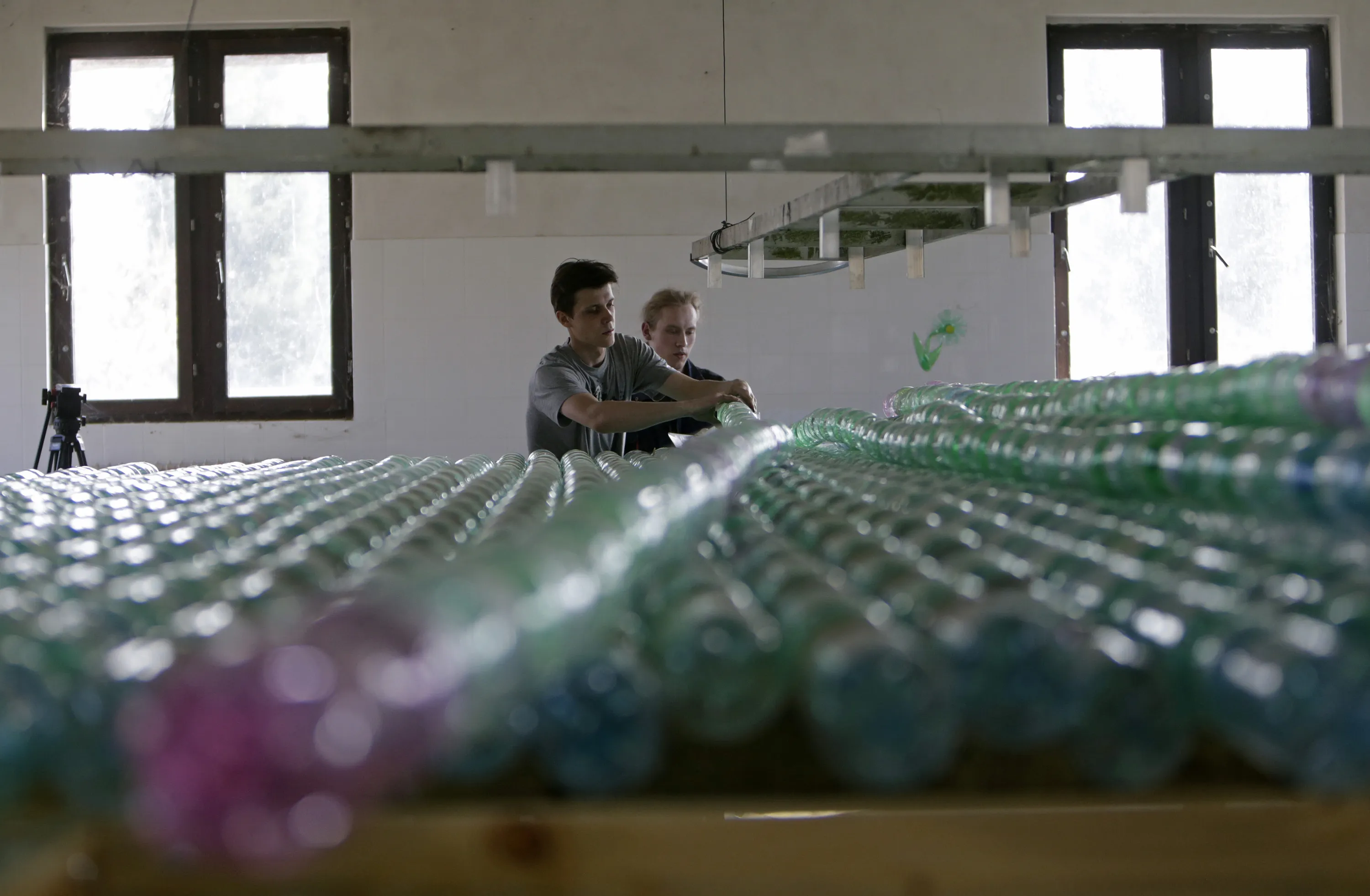 Jakub Bures (R) and Jan Kara tie plastic bottles as they build a boat in their garage in Nymburk April 3, 2014. (Photo by David W. Cerny/Reuters)