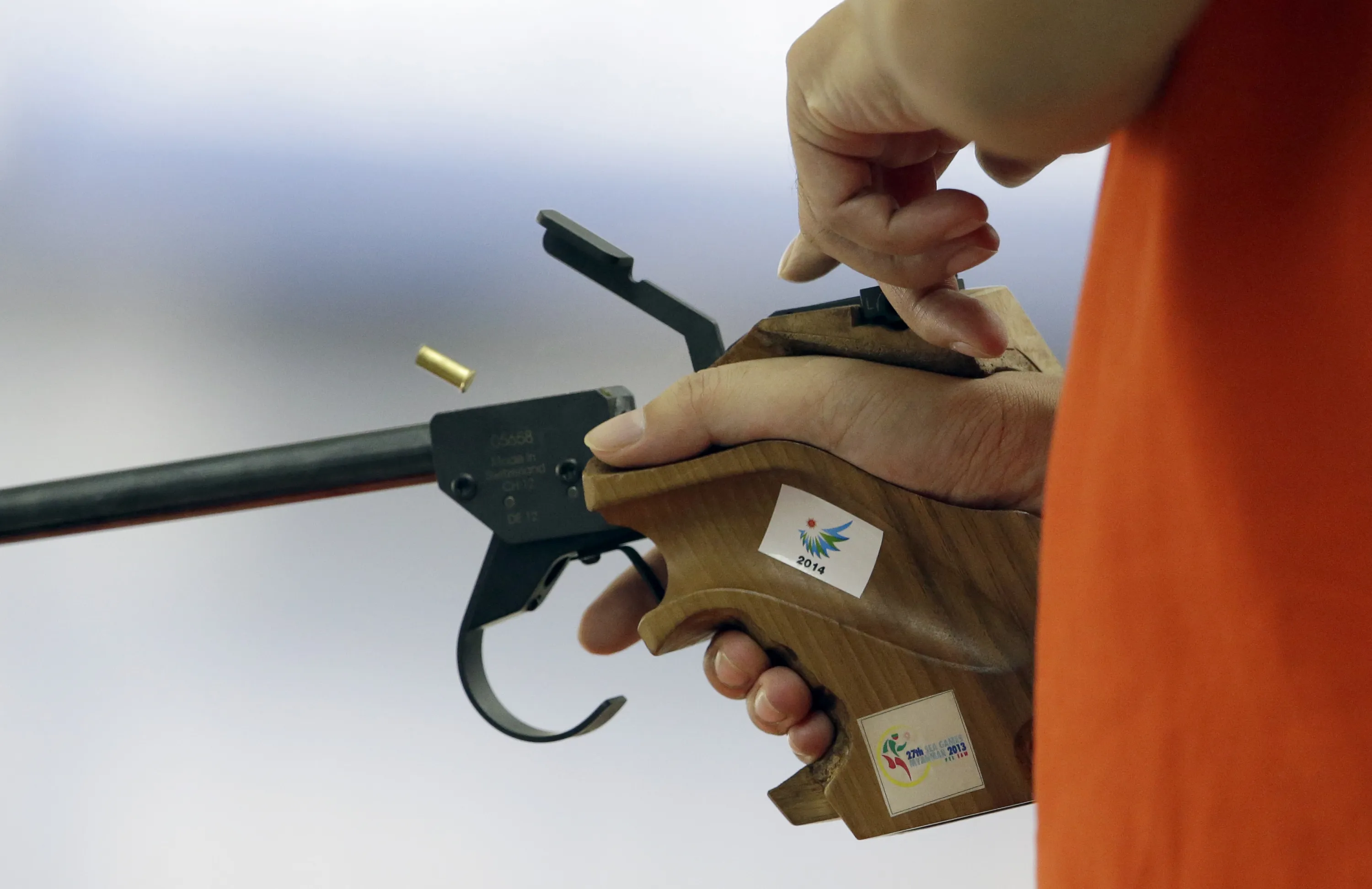 A bullet casing is expelled out of Vietnam's Nguyen Hoang Phuong in the final of the 50m Pistol Men at the Ongnyeon International Shooting Range for the 17th Asian Games in Incheon, South Korea, Saturday, September 20, 2014. (Photo by Lee Jin-man/AP Photo)