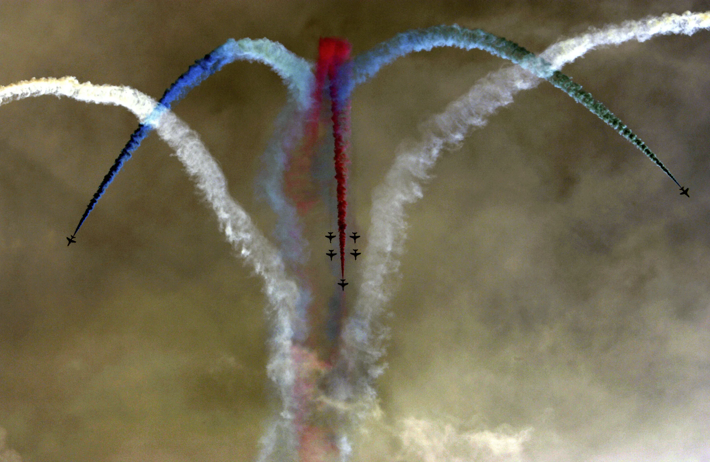 British Royal Air Force Red Arrows squadron performs aerobatics over Athens' Saronic Gulf, September 6, 2005. (Photo by Yannis Behrakis/Reuters)