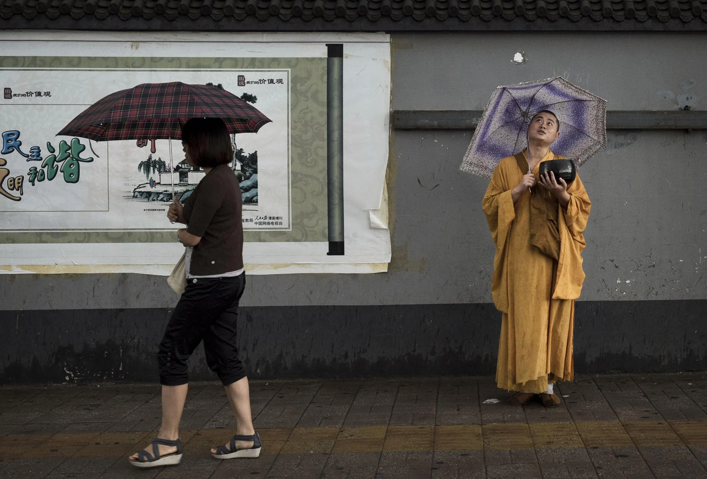 A Chinese Buddhist monk holds a begging bowl as he waits for alms from passerby while standing in the rain on September 2, 2014 in Beijing, China. (Photo by Kevin Frayer/Getty Images)