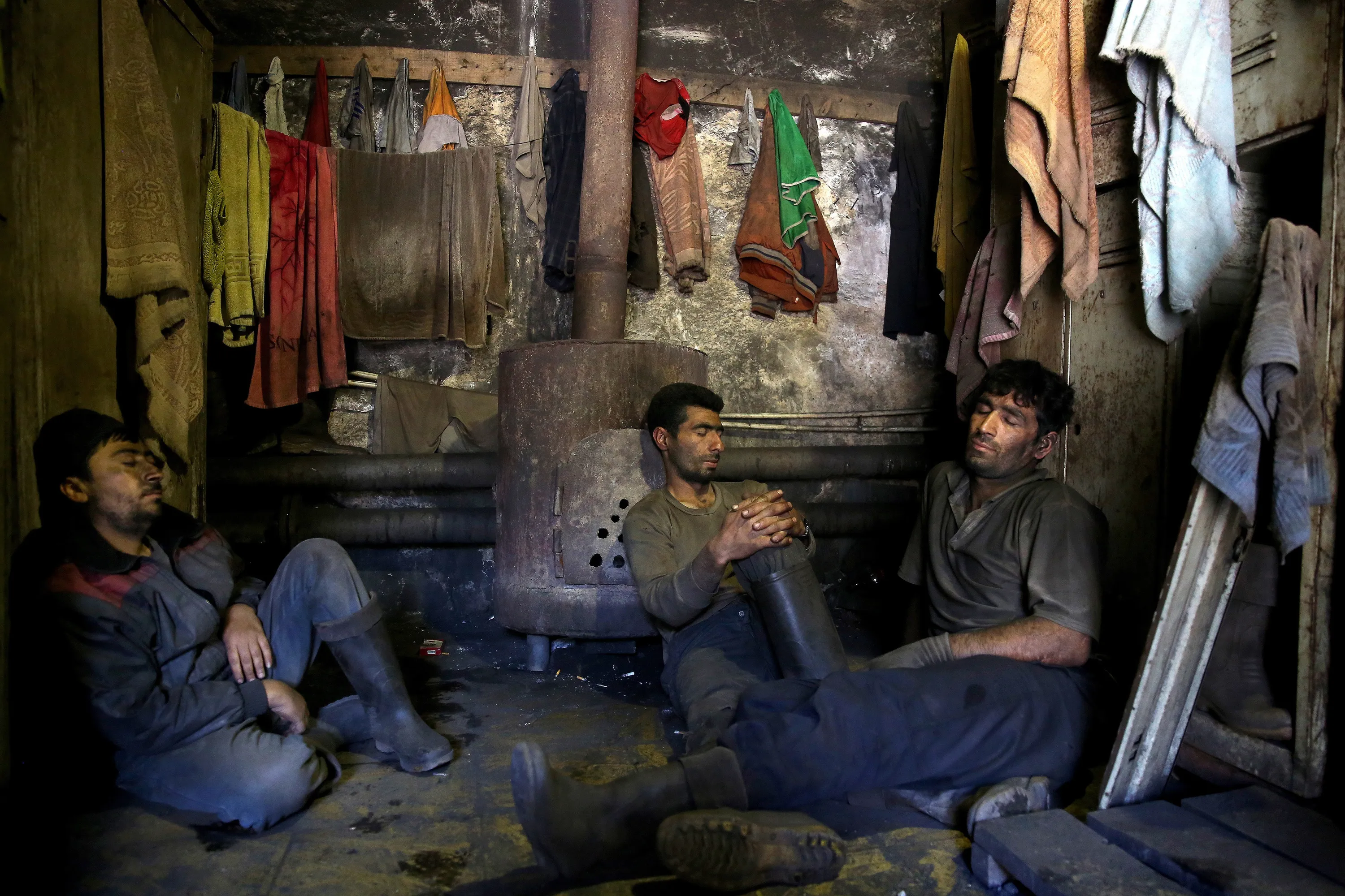 In this Tuesday, May 6, 2014 photo, Iranian coal miners rest during a break at a mine on a mountain in Mazandaran province, near the city of Zirab, 212 kilometers (132 miles) northeast of the capital Tehran, Iran. The miners put in long hours in often dangerous conditions and make just $300 a month, little more than minimum wage. (Photo by Ebrahim Noroozi/AP Photo)