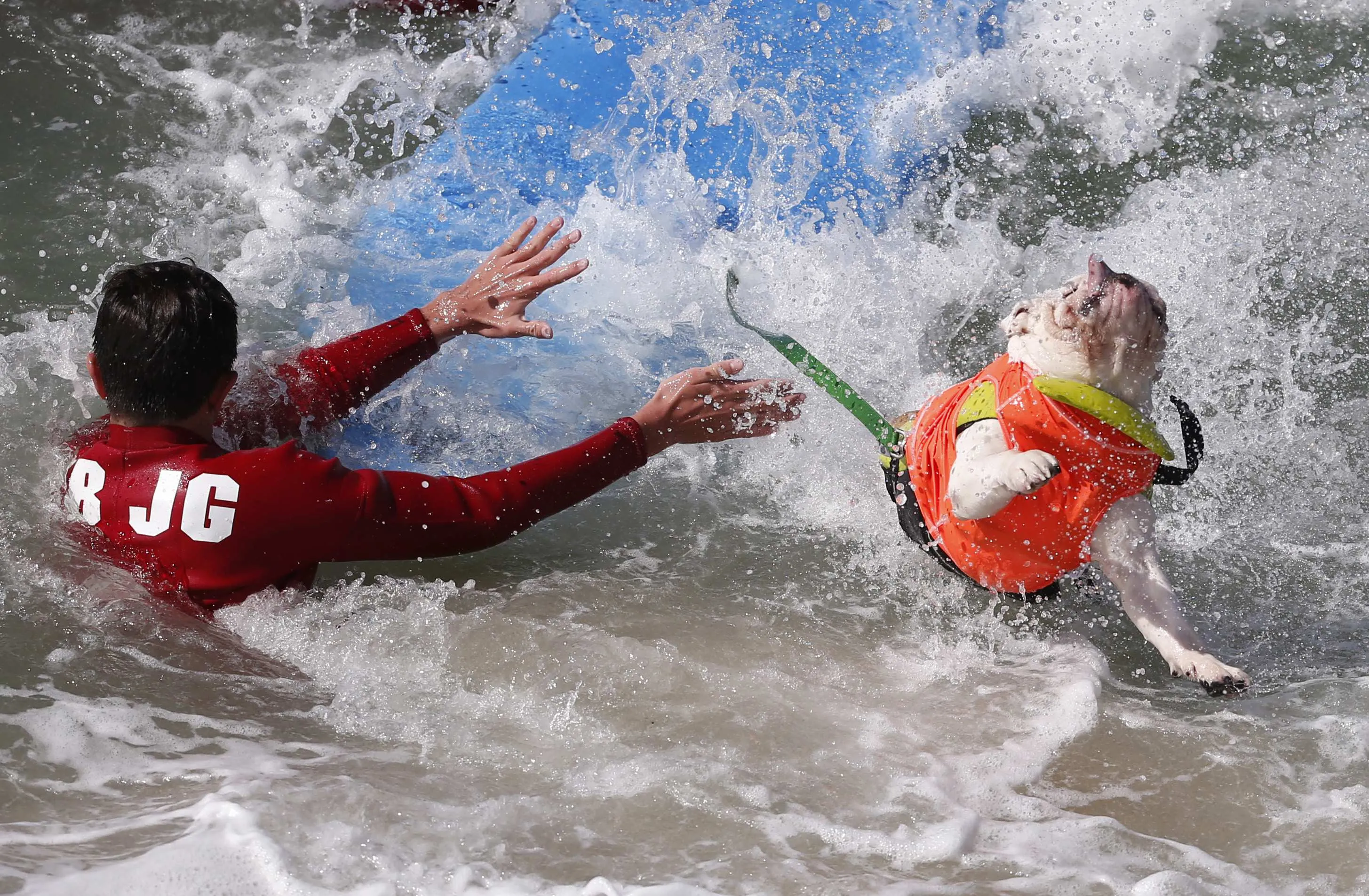 A dog wipes out at the 6th Annual Surf City surf dog contest in Huntington Beach, California September 28, 2014. (Photo by Lucy Nicholson/Reuters)