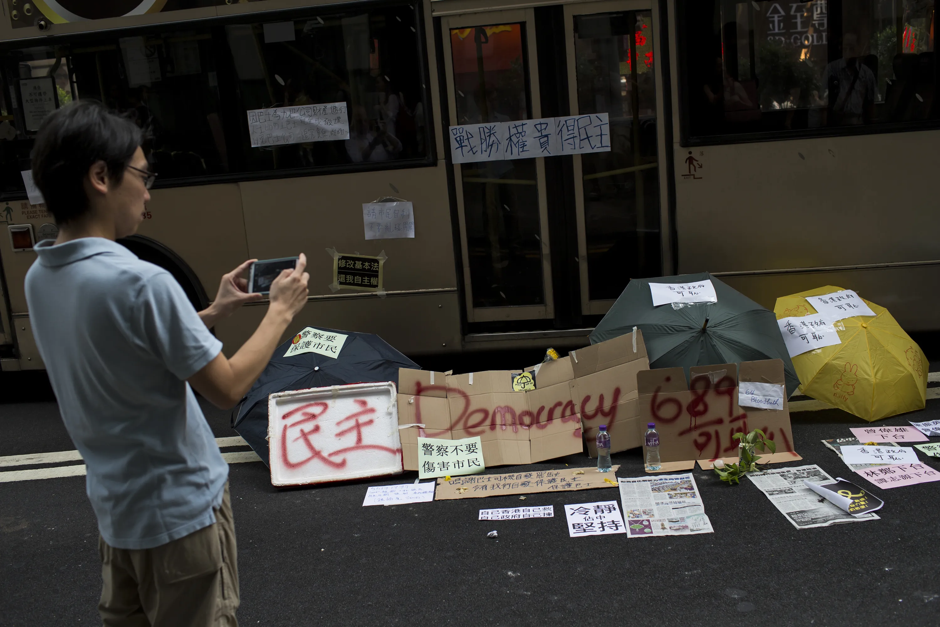 A man takes picture of umbrellas and signs placed along a main street at Mongkok shopping district, which was occupied by protesters, in Hong Kong September 30,2014. One of the signs reads: “Shame of the Hong Kong Government”. (Photo by Tyrone Siu/Reuters)