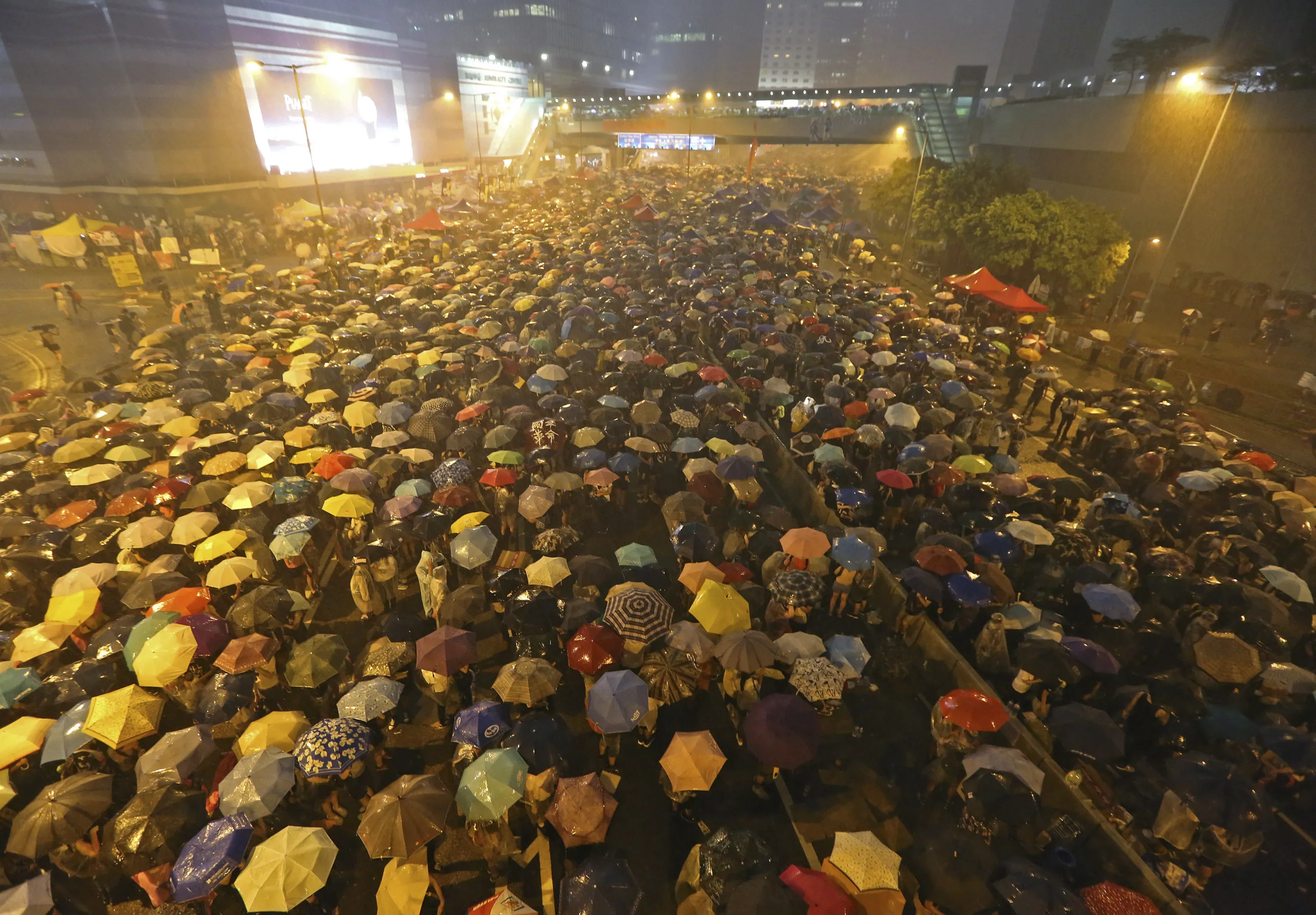 Pro-democracy protesters hold umbrellas under heavy rain in a main street near the government headquarters in Hong Kong late Tuesday, September 30, 2014. The protesters demanded that Hong Kong's top leader meet with them on Tuesday and threatened wider actions if he did not, after he said China would not budge in its decision to limit voting reforms in the Asian financial hub. (Photo by AP Photo)