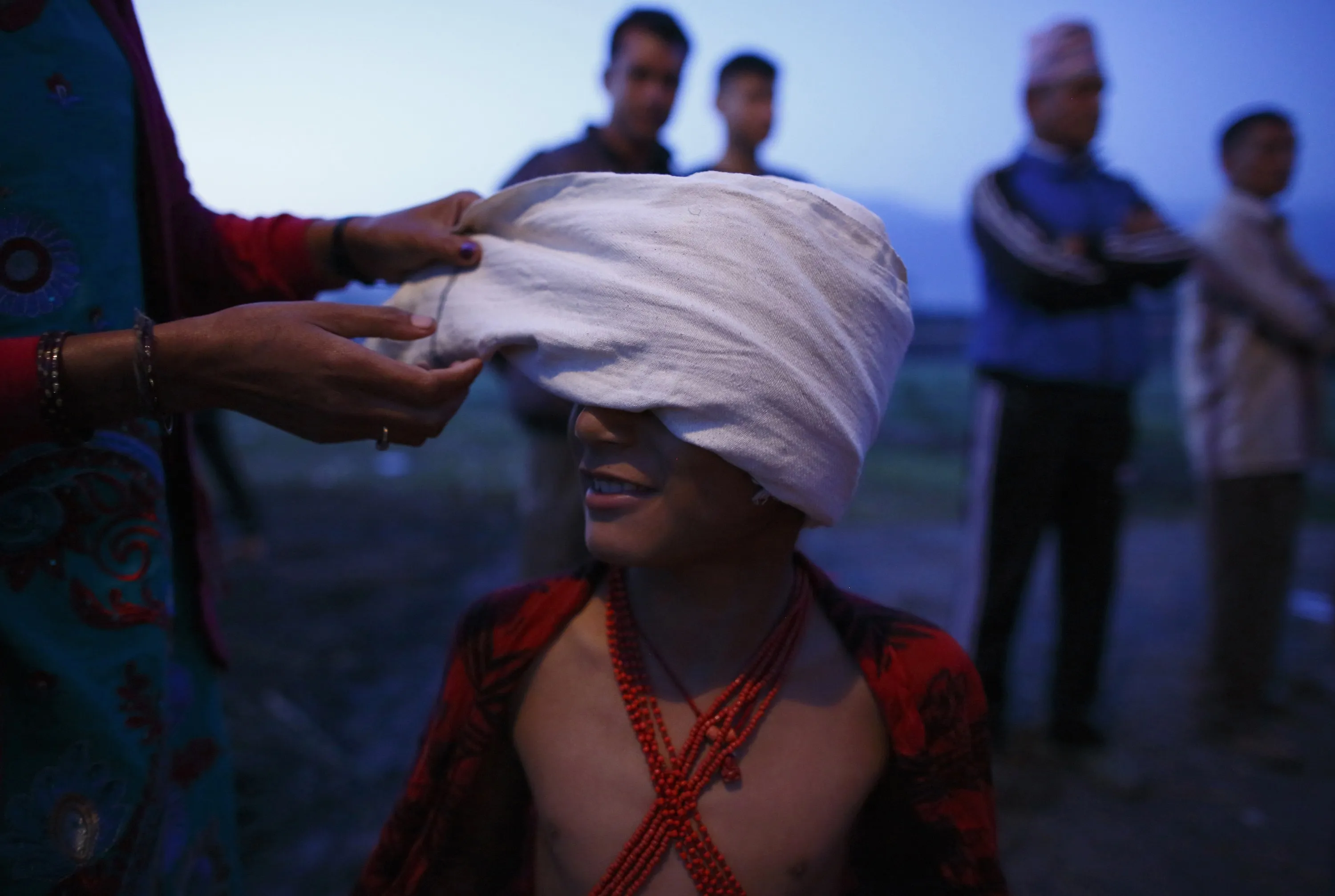A devotee is prepared before he offers prayers during the “Dashain”, Hinduism's biggest religious festival in Bhaktapur October 3, 2014. (Photo by Navesh Chitrakar/Reuters)
