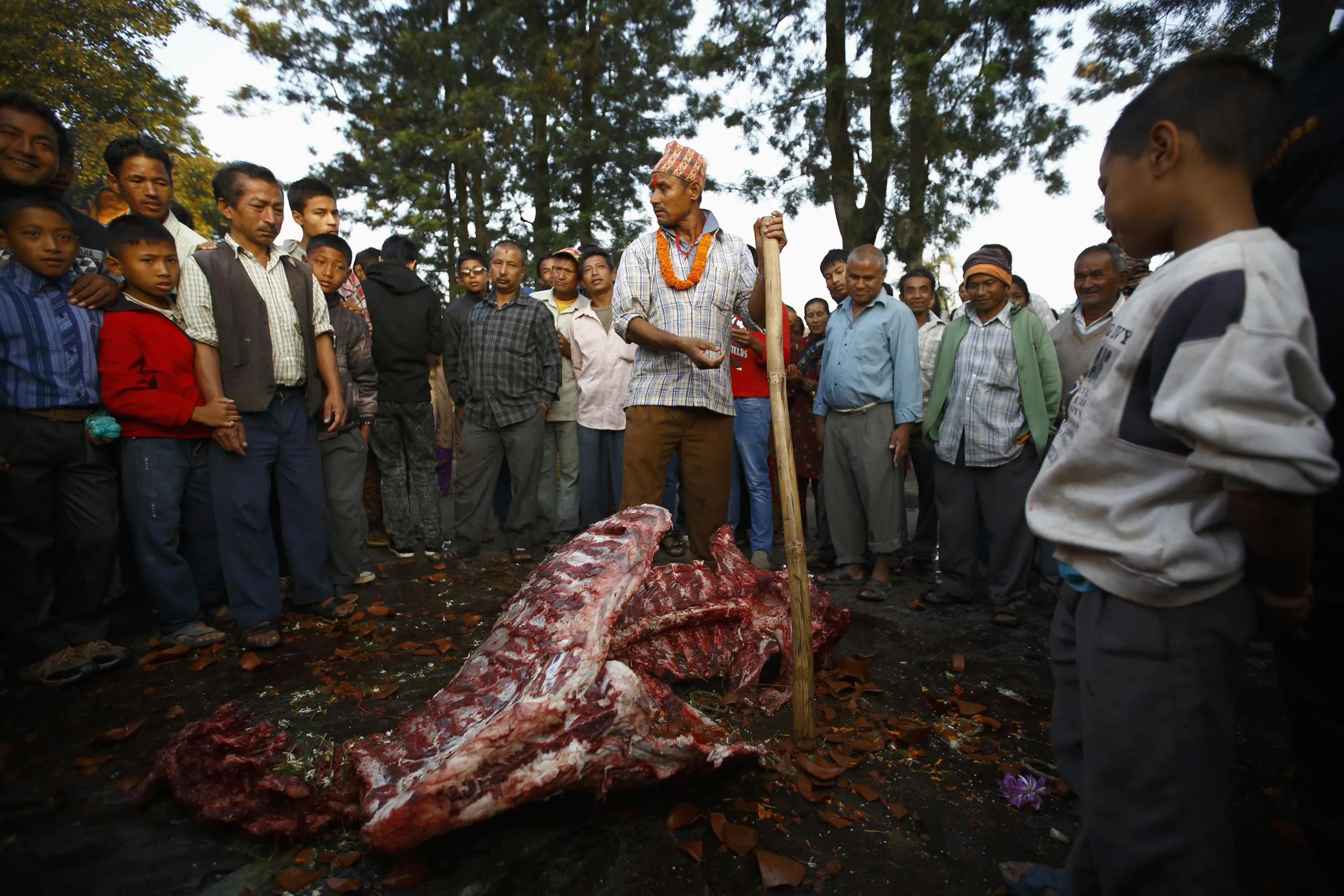 Devotees gather in front of a buffalo carcass during the sacrificial ceremony held to mark the “Dashain”, Hinduism's biggest religious festival in Bhaktapur October 3, 2014. (Photo by Navesh Chitrakar/Reuters)