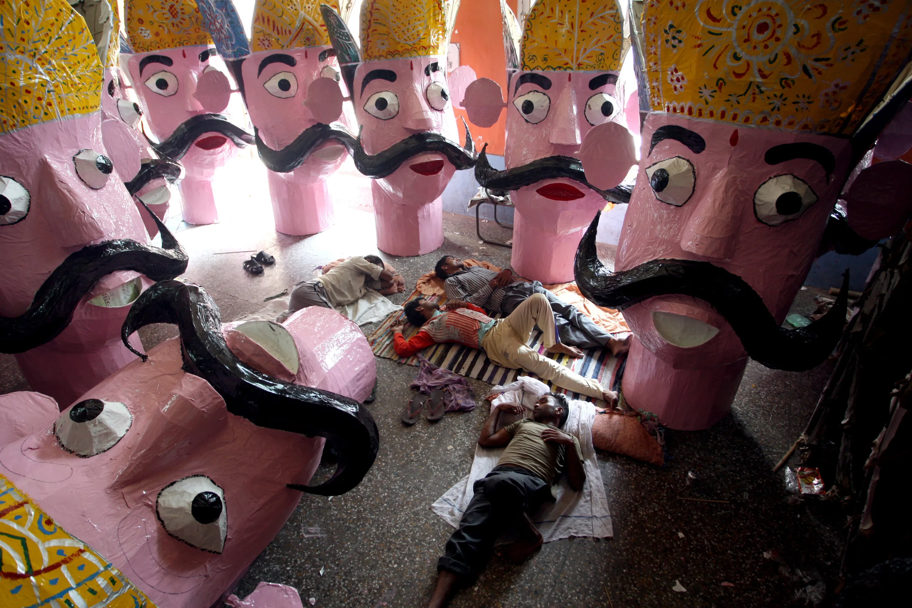 Indian artists rest near the effigies of mythical demon King Ravana as preparations for the Dussehra festival celebrations are ongoing in Jammu, the winter capital of Kashmir, India, 29 September 2014. The effigies are burnt at the Hindu festival Dussehra that commemorates the triumph of Lord Rama over the demon king Ravana, marking the victory of good over evil. (Photo by Jaipal Singh/EPA)