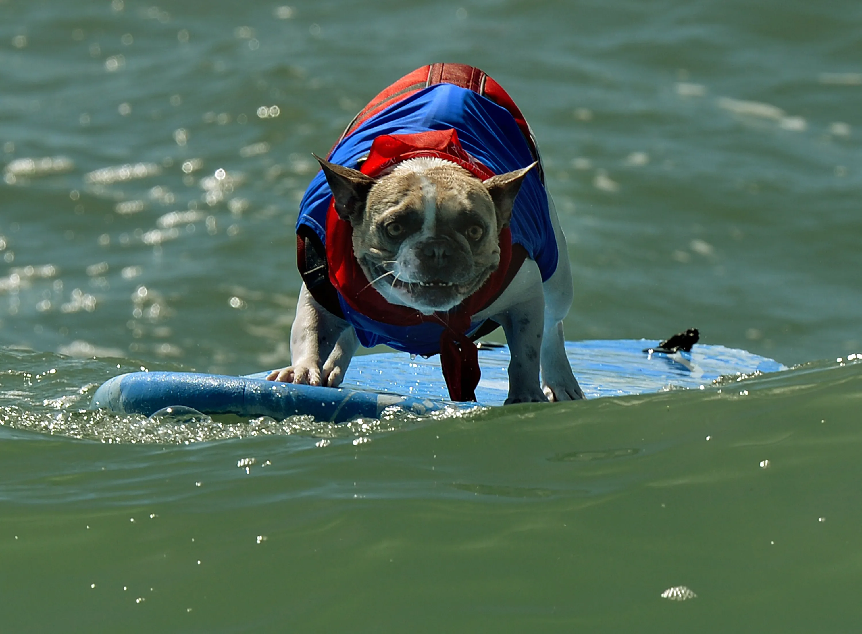 A Surfer Dog rides a wave in the small dog division during the 6th Annual Surf Dog competition at Huntington Beach, California on September 28, 2014. (Photo by Mark Ralston/AFP Photo)
